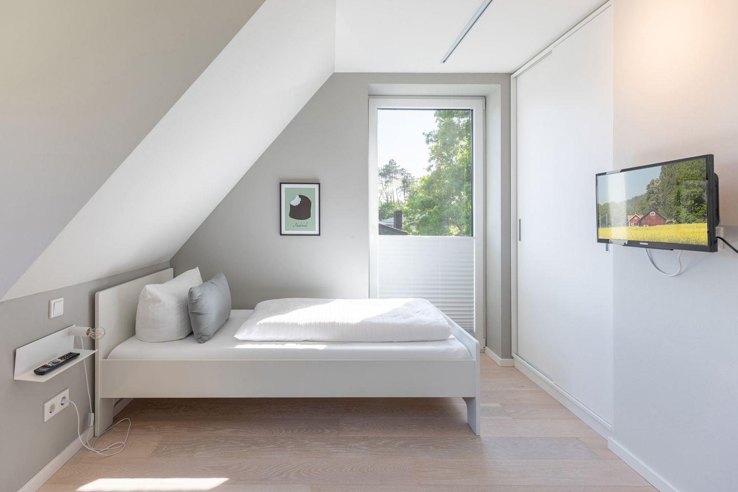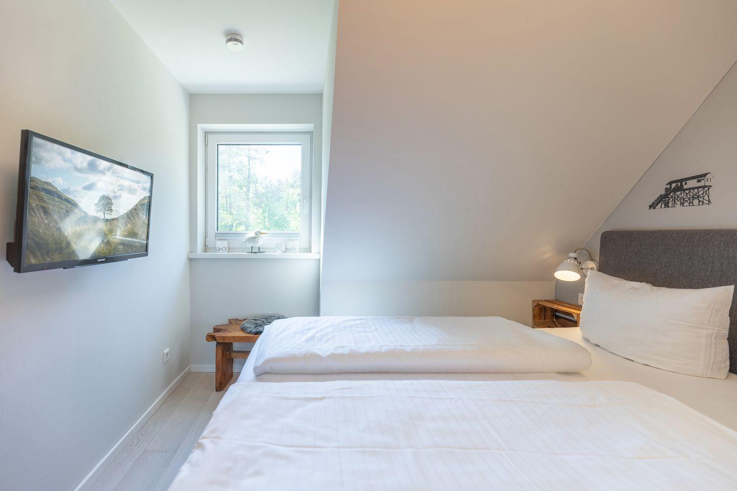 Über eine geschlossene Holztreppe erreichen Sie das erste Obergeschoss mit einem Elternschlafzimmer mit Doppelbett (180x200) und einem weiteren Schlafraum mit zwei Einzelbetten. Über eine weitere Treppe erreichen Sie den ausgebauten Spitzboden mit einem weiteren Einzelbett und einer Spielecke für die Kleinen.