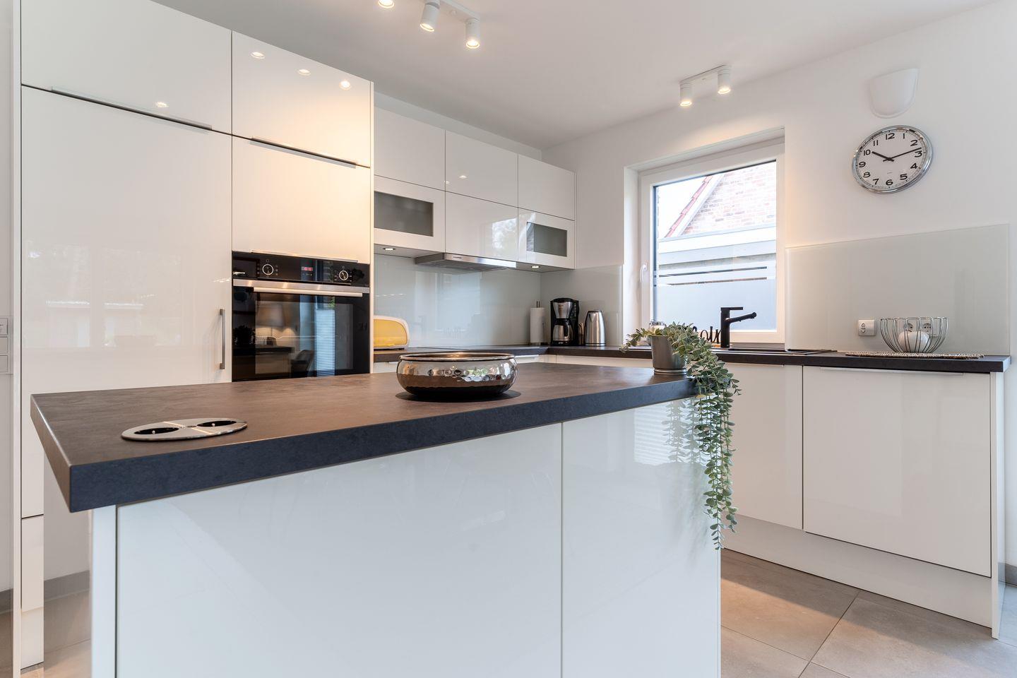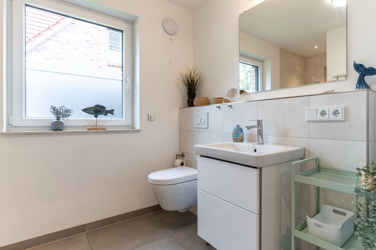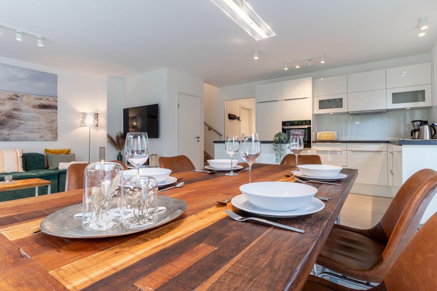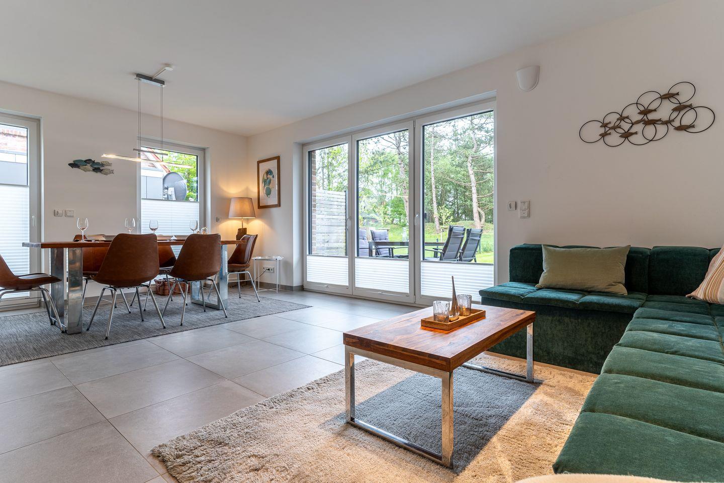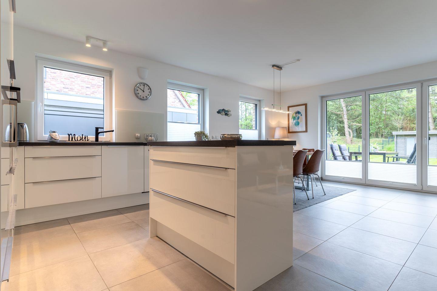 Im Erdgeschoss erwartet Sie ein großzügiger Wohnbereich, der perfekt zum Entspannen und Verweilen einlädt. Eine moderne Küche in strahlendem Weiß mit Induktionsherd und Geschirrspüler lässt keine Wünsche offen. Ein Gästebad mit einer ebenerdigen Dusche sowie Waschmaschine und Trockner sorgen für zusätzlichen Komfort. Von der möblierten Terrasse mit einem einladenden Strandkorb aus öffnet sich der Blick in den großzügigen Garten in herrlicher Südlage.