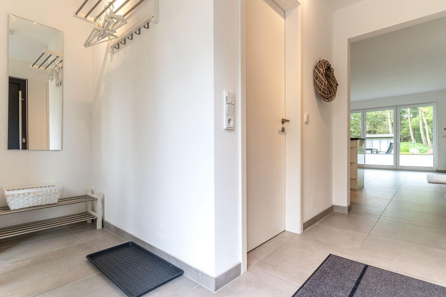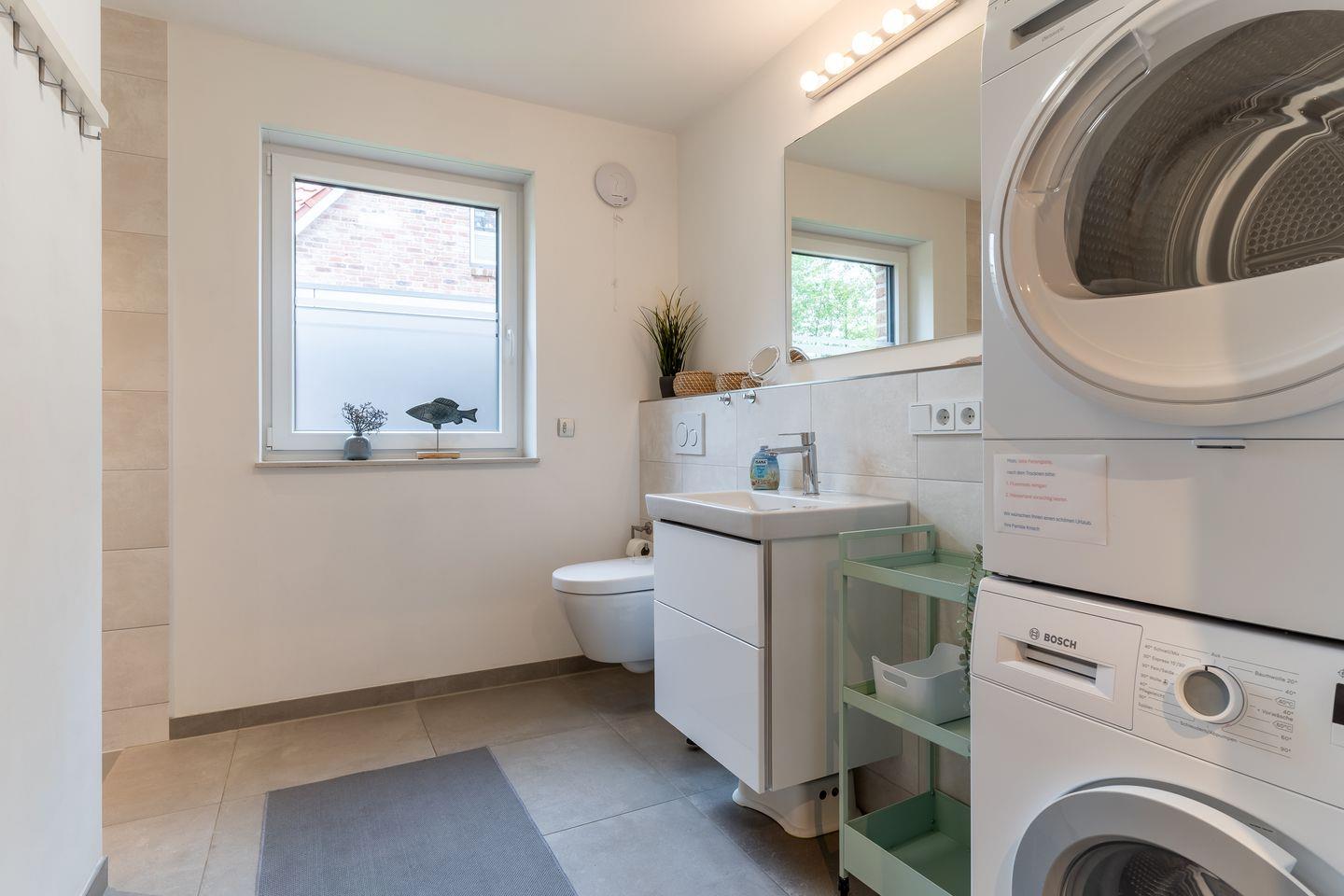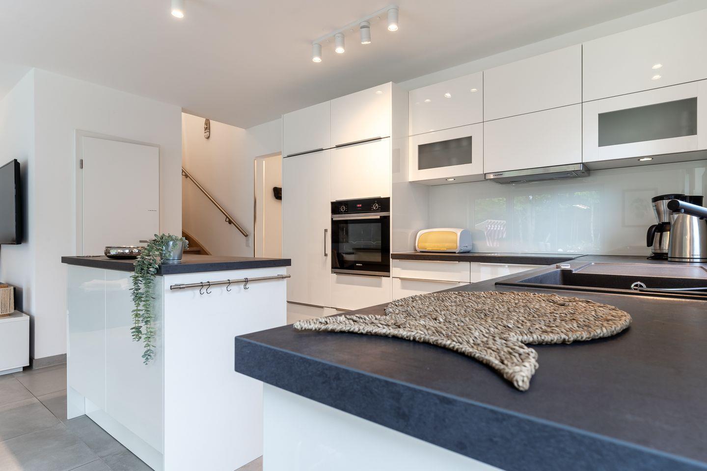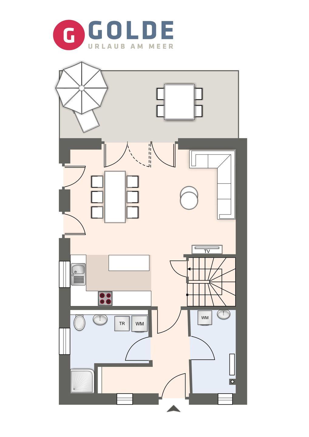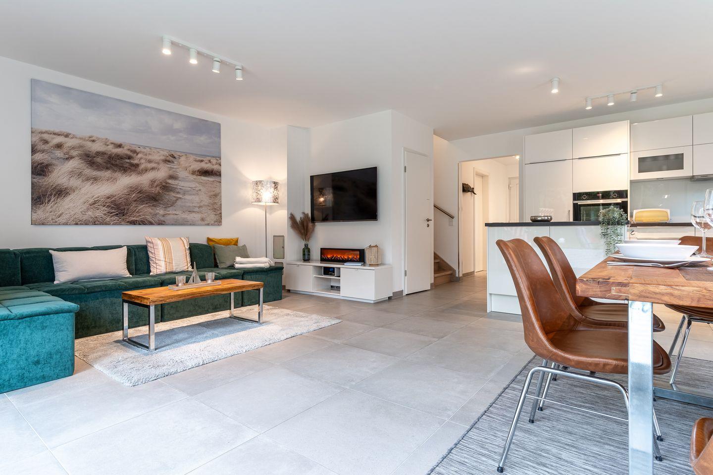 Im Erdgeschoss erwartet Sie ein großzügiger Wohnbereich, der perfekt zum Entspannen und Verweilen einlädt. Eine moderne Küche in strahlendem Weiß mit Induktionsherd und Geschirrspüler lässt keine Wünsche offen. Ein Gästebad mit einer ebenerdigen Dusche sowie Waschmaschine und Trockner sorgen für zusätzlichen Komfort. Von der möblierten Terrasse mit einem einladenden Strandkorb aus öffnet sich der Blick in den großzügigen Garten in herrlicher Südlage.