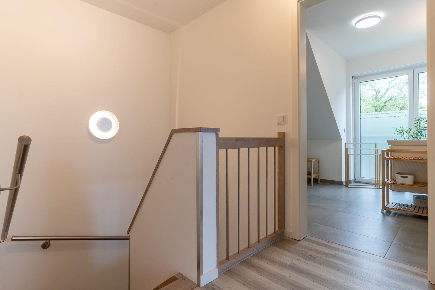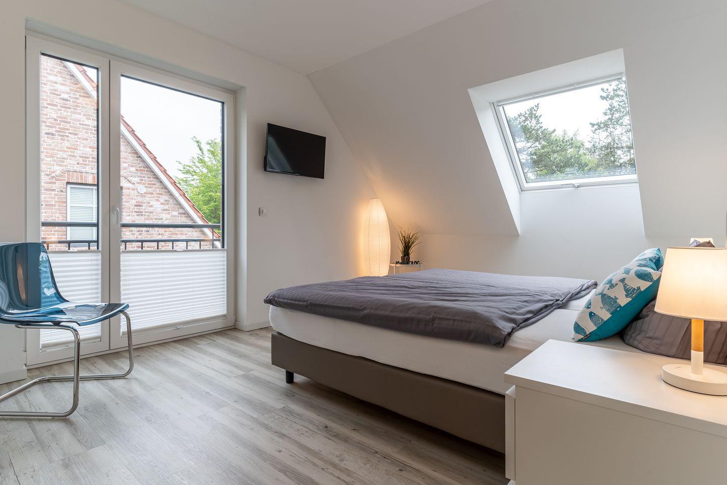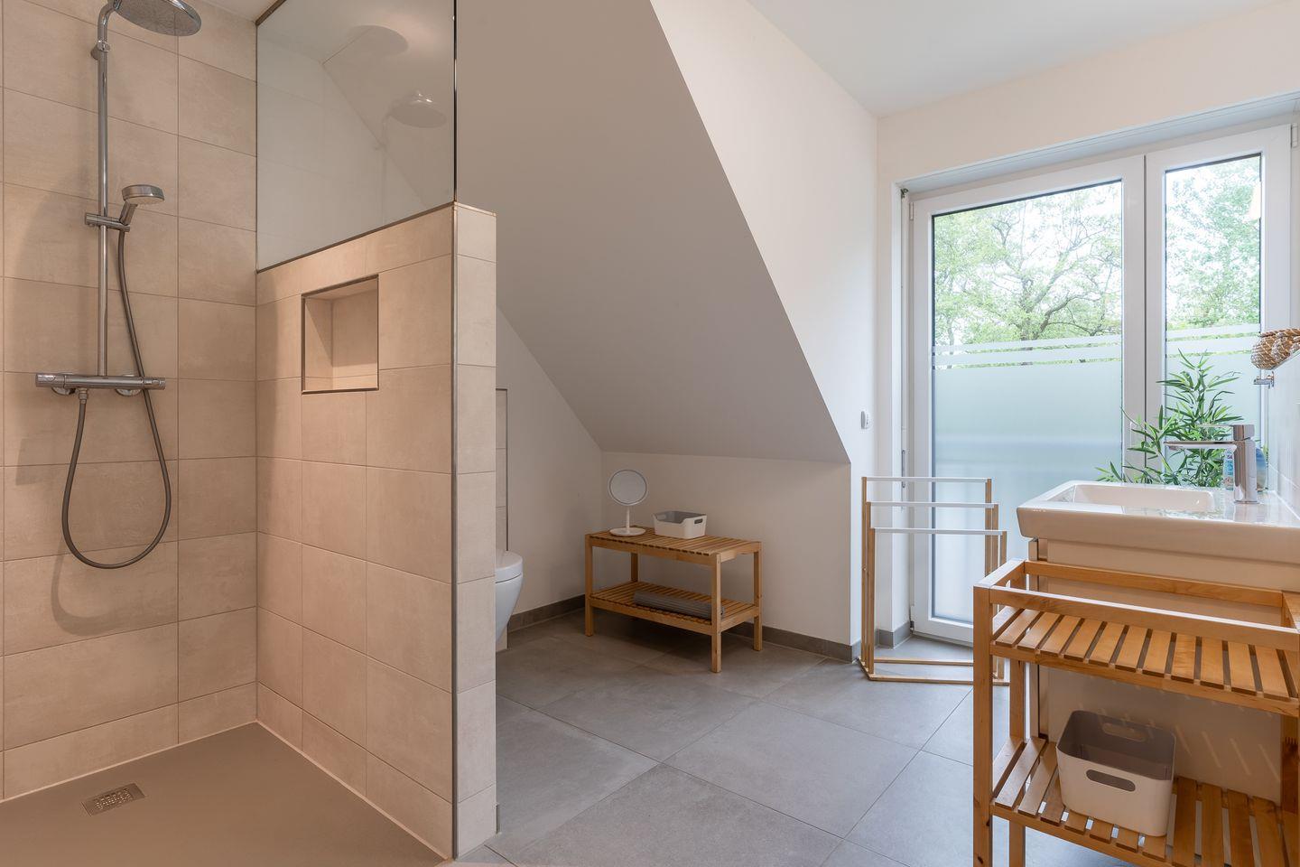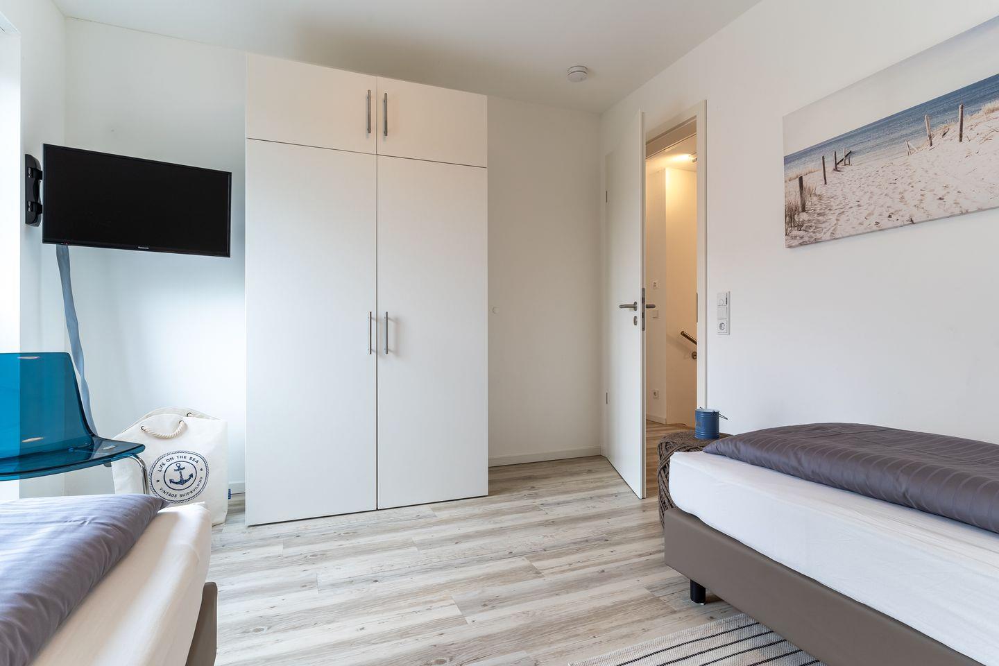Im Obergeschoss befinden sich zwei traumhaft eingerichtete Schlafzimmer, jedes ausgestattet mit erstklassigen Boxspringbetten (1 Doppelbett und zwei Einzelbetten) für puren Schlafkomfort. Das großzügige Bad verführt mit einer Wellnessdusche zum Verweilen.