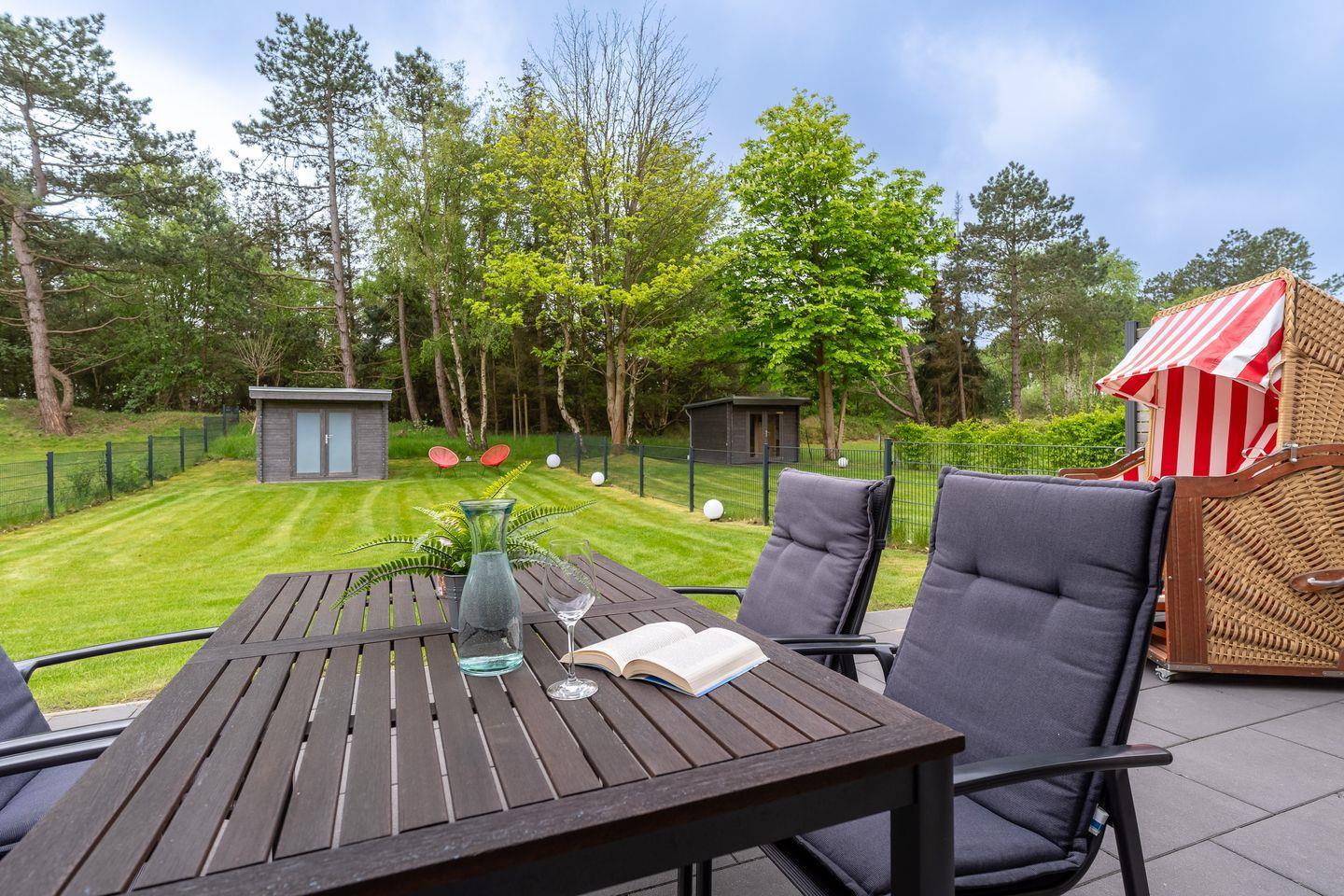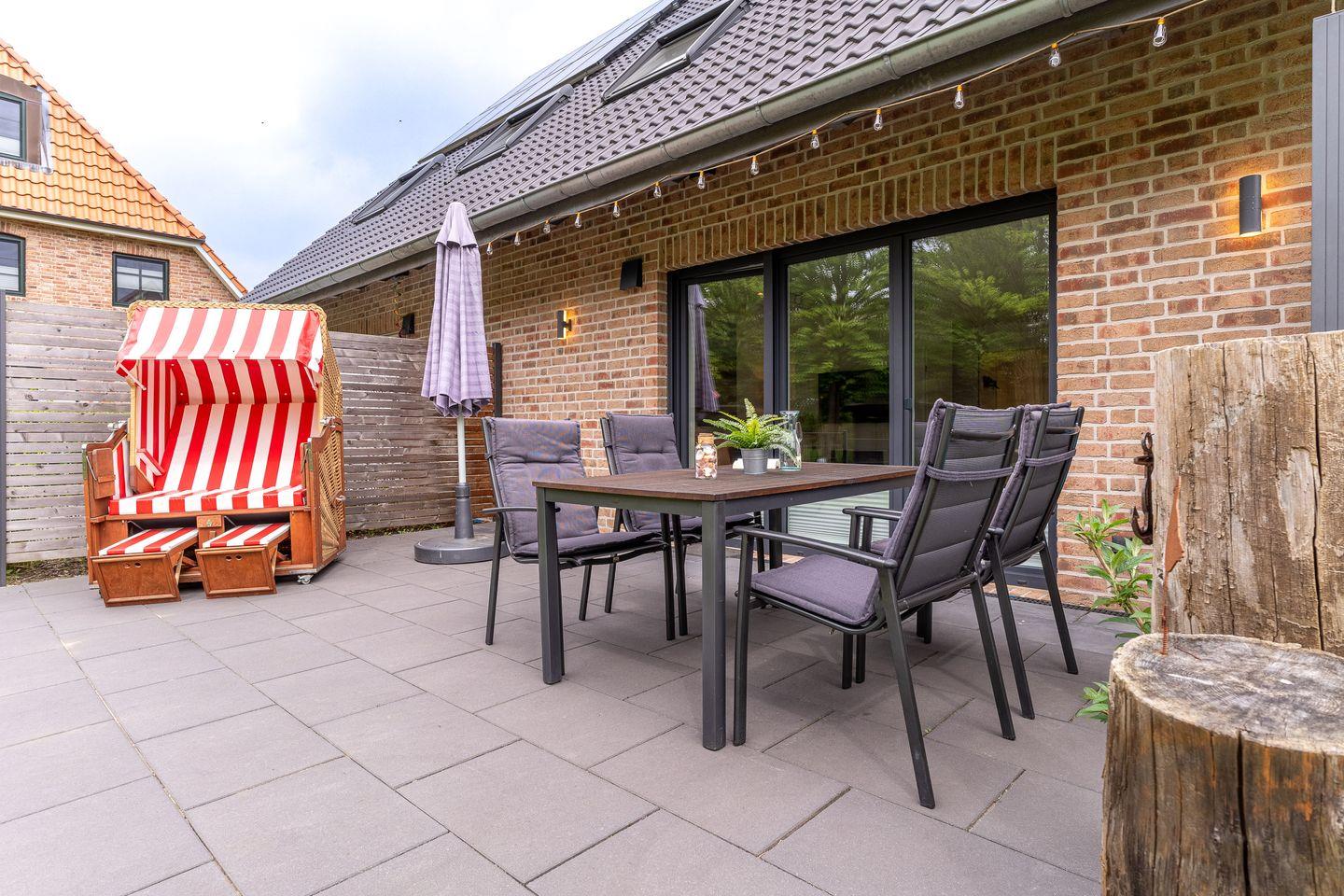 Der Außenbereich dieses kleinen Juwels besticht durch einen sonnigen Garten in Südlage und einen direkten Zugang zum Deich und Südstrand, nur wenige Schritte durch das angrenzende Wäldchen entfernt. Die liebevoll gestaltete Terrasse mit eleganten Gartenmöbeln und einem gemütlichen Strandkorb lädt dazu ein, die Seele baumeln zu lassen. Ein praktisches Gartenhaus bietet Abstellmöglichkeiten für Fahrräder und einen PKW-Stellplatz, damit Sie sich voll und ganz auf Ihren wohlverdienten Urlaub konzentrieren können.