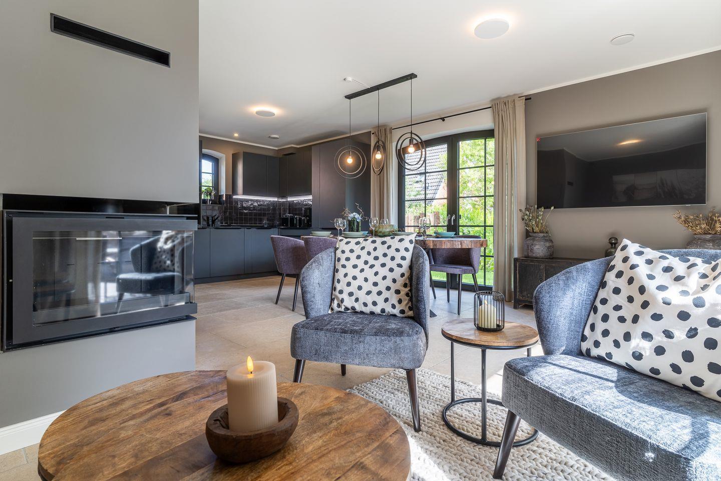 Der großzügige Wohnbereich bietet einen großen Esstisch mit Sitzplätzen für 6 Personen und eine gemütliche Sofaecke am Kamin.