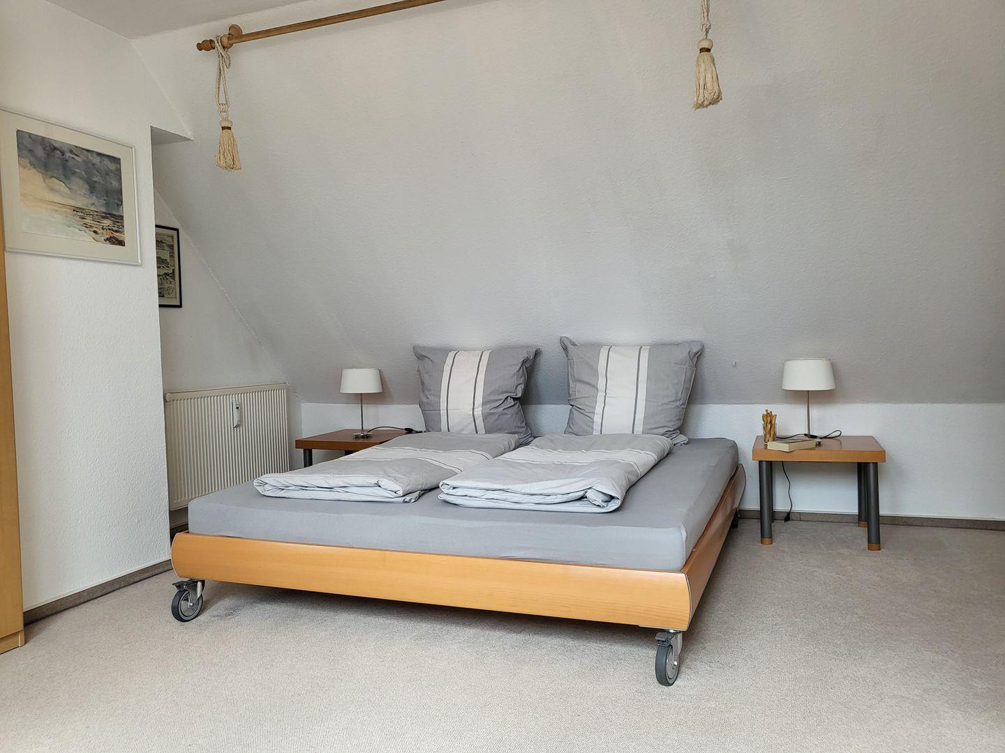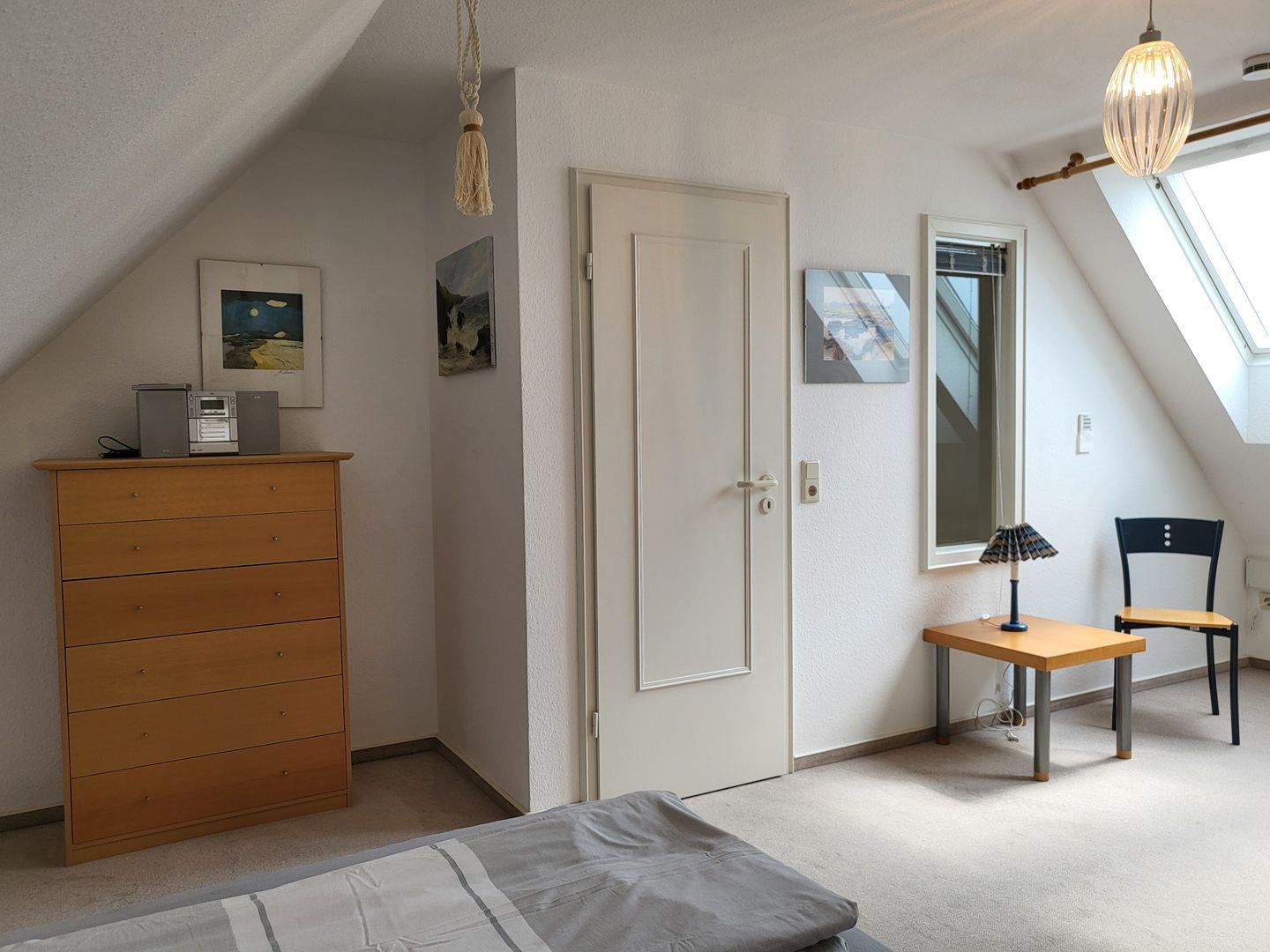 Die beiden Schlafzimmer sind hell und freundlich eingerichtet und sorgen für erholsame Nächte. Eines der Zimmer bietet ein bequemes Doppelbett (180x200cm), einenKleiderschrank und einen gläsernen Schreibtisch. Elektrische Rolläden sorgen bei beiden Dachflächenfenstern für eine komplette Abdunkelung für einen erholsamen Schlaf.