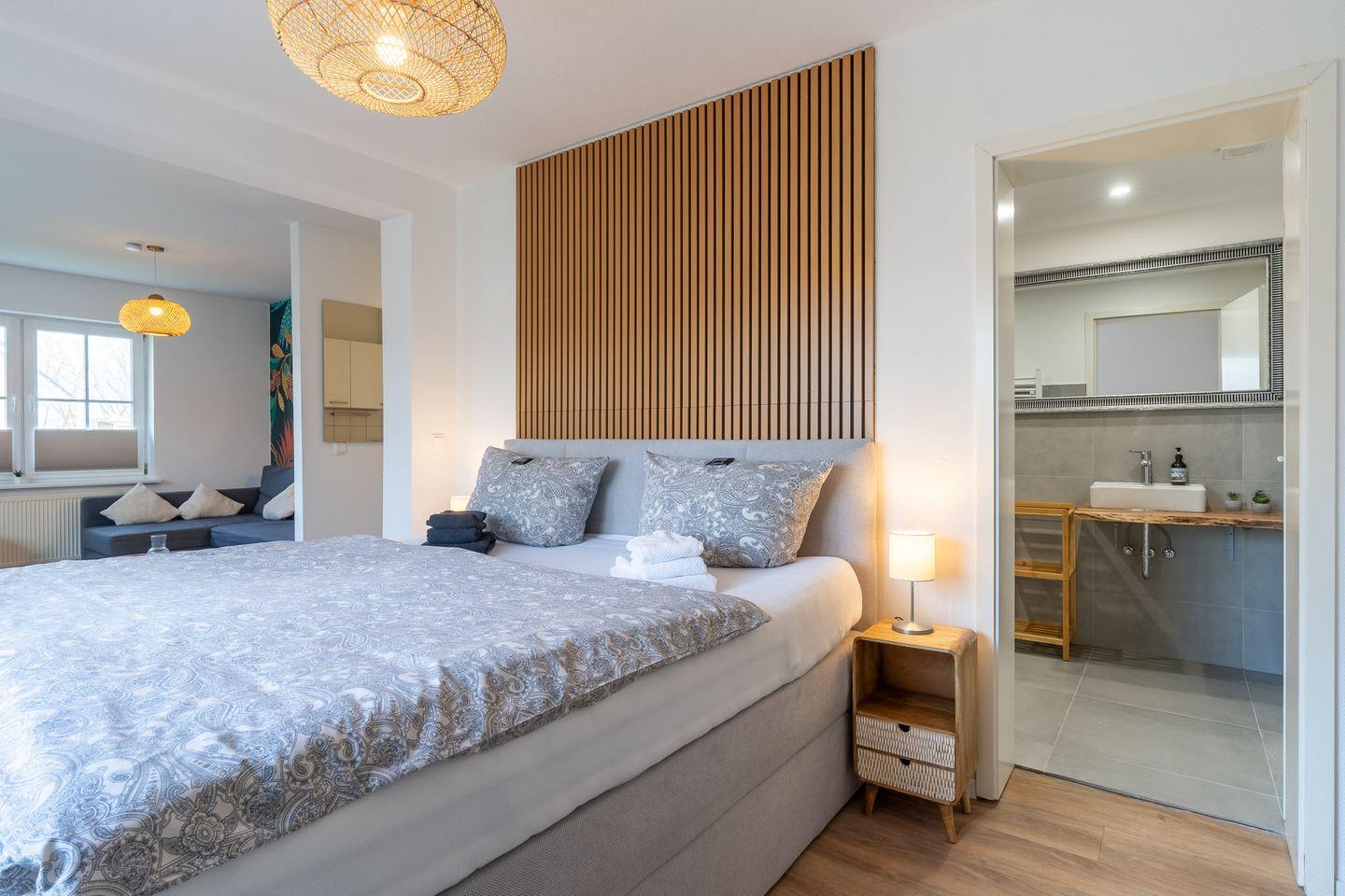 Unsere Ferienwohnung ist mit einer modernen Küchenzeile ausgestattet, die Ihnen alles bietet, was Sie zur Selbstversorgung benötigen, einschließlich einer Spülmaschine, neuen Fronten sowie komplettem Geschirr und Besteck. Genießen Sie erholsamen Schlaf im neuen Boxspringbett (1,80 x 2,00 m), das sich harmonisch in den Wohnbereich einfügt.