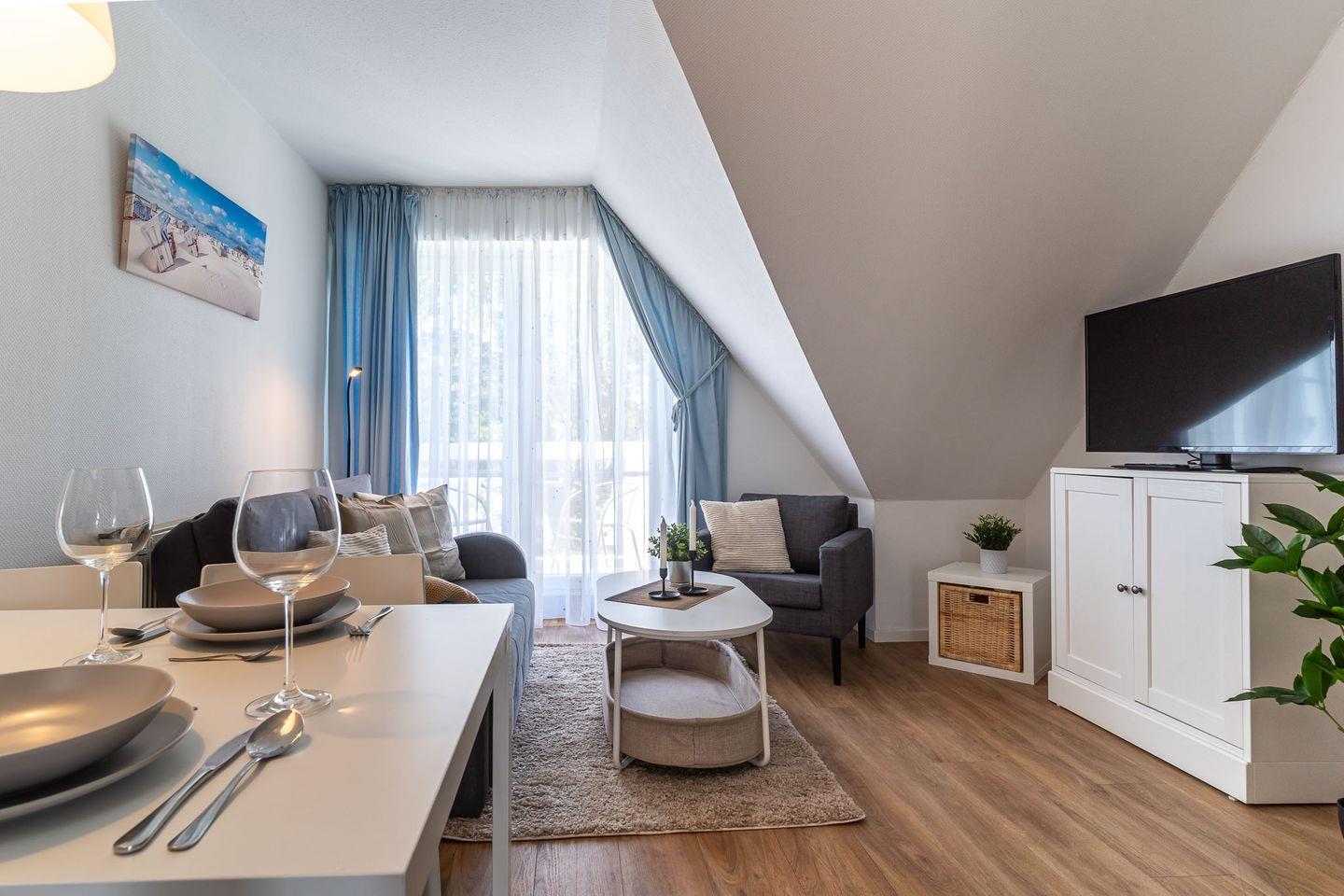Der gemütliche Wohnbereich mit offener Küche befindet sich ebenfalls im ersten Stock. Hier finden Sie alles, was Sie für eine entspannte Selbstversorgung benötigen. Die Küchenzeile ist mit einer Spülmaschine, einem Backofen und allen wichtigen Küchenutensilien ausgestattet. Vom Wohnbereich aus gelangen Sie direkt auf den Balkon, wo Sie die frische Nordseeluft und den Blick ins Grüne genießen können.