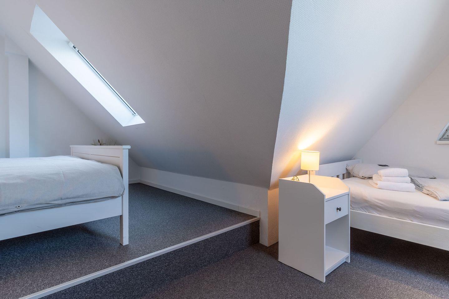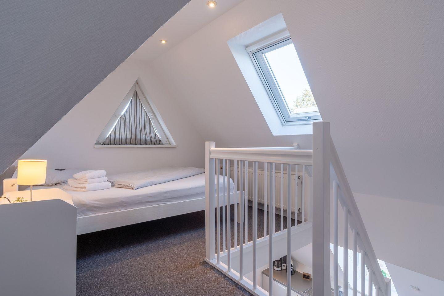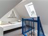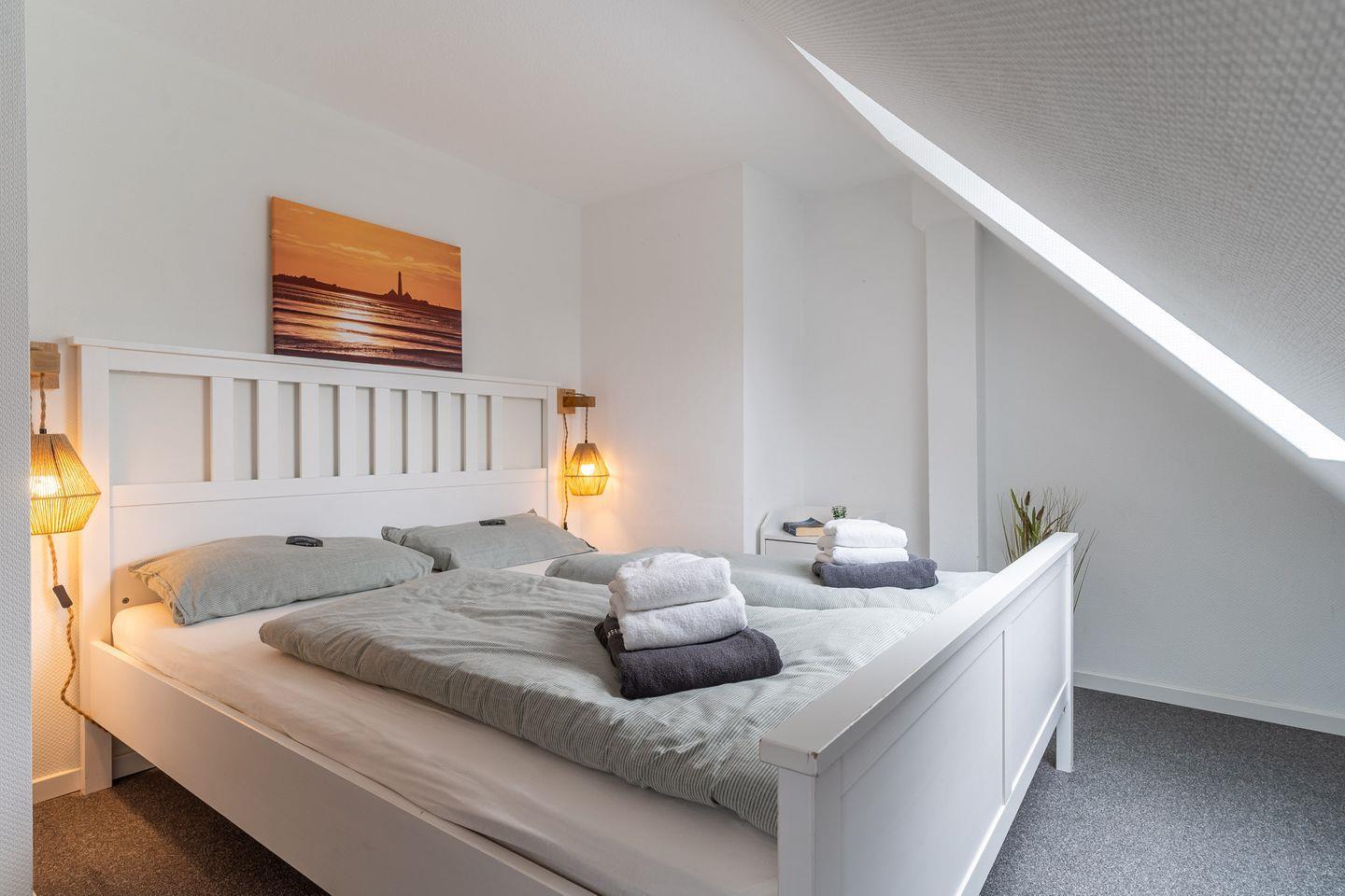 Eine Treppe führt Sie in das 2. Obergeschoss, wo sich der offene Schlafraum befindet. Dieser bietet ein bequemes französisches Bett (1,20 x 2,00 m) und ein zusätzliches Doppelbett (1,60 x 2,00 m). Hier finden Sie die Ruhe und Erholung, die Sie nach einem ereignisreichen Tag an der Nordsee benötigen.