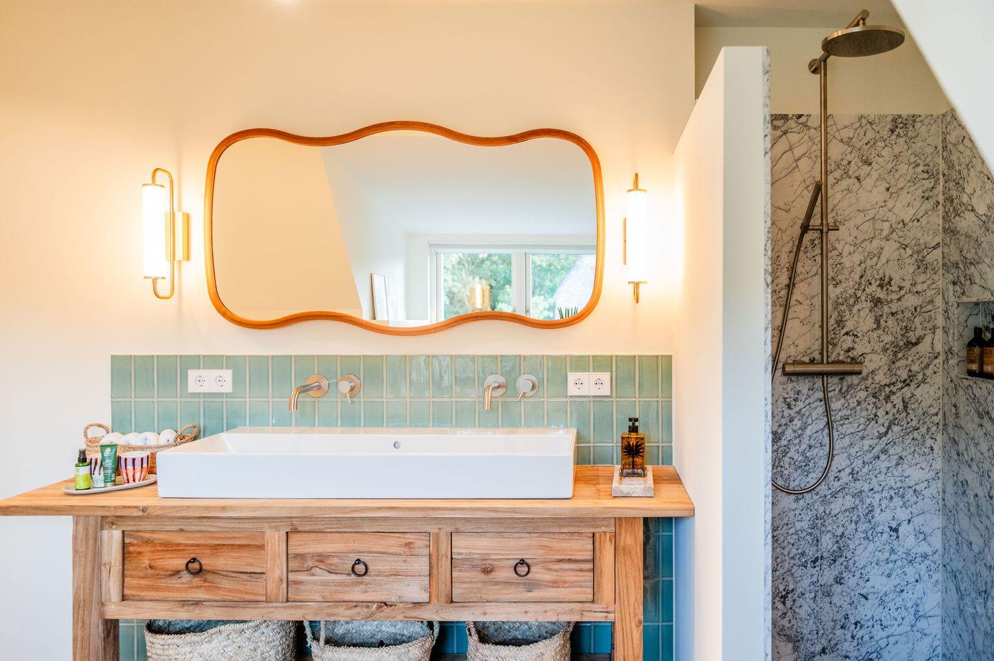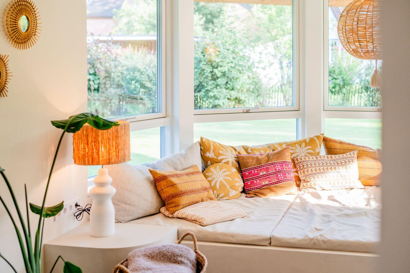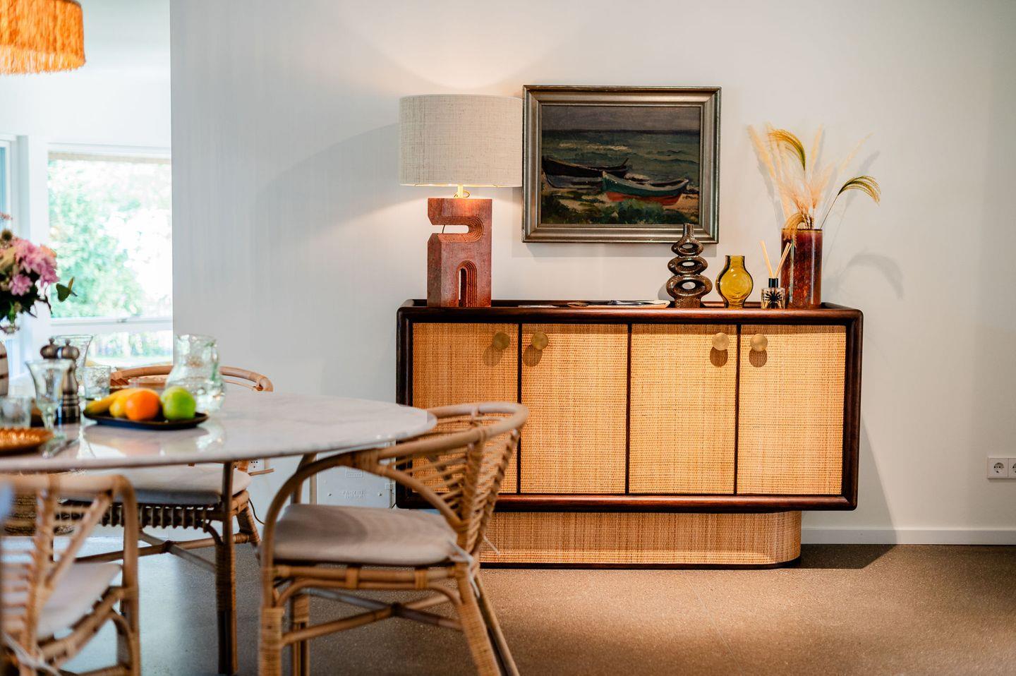 Unserer Ferienhaus "gegen den Wind" empfängt dich in einem lichtdurchfluteten Wohn- und Essbereich mit offener Küche. Diese ist mit hochwertigen Geräten von Smeg ausgestattet und bietet alle notwendigen Utensilien, um köstliche Mahlzeiten zuzubereiten. Das liebevoll eingerichtete Ferienhaus beeindruckt durch ein stilvolles Zusammenspiel von maritimen Elementen, fernöstlichem Flair und nordischer Eleganz. Zwei Highlights des offenen Wohnbereichs sind der einladende offene Kamin für gesellige Stunden und der Loungebereich, der absolute Entspannung und Gemütlichkeit bietet – ideal zum Relaxen, Musik hören oder Bücher lesen.