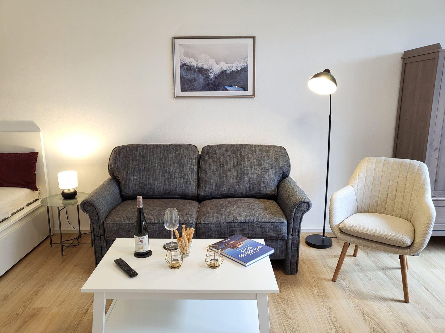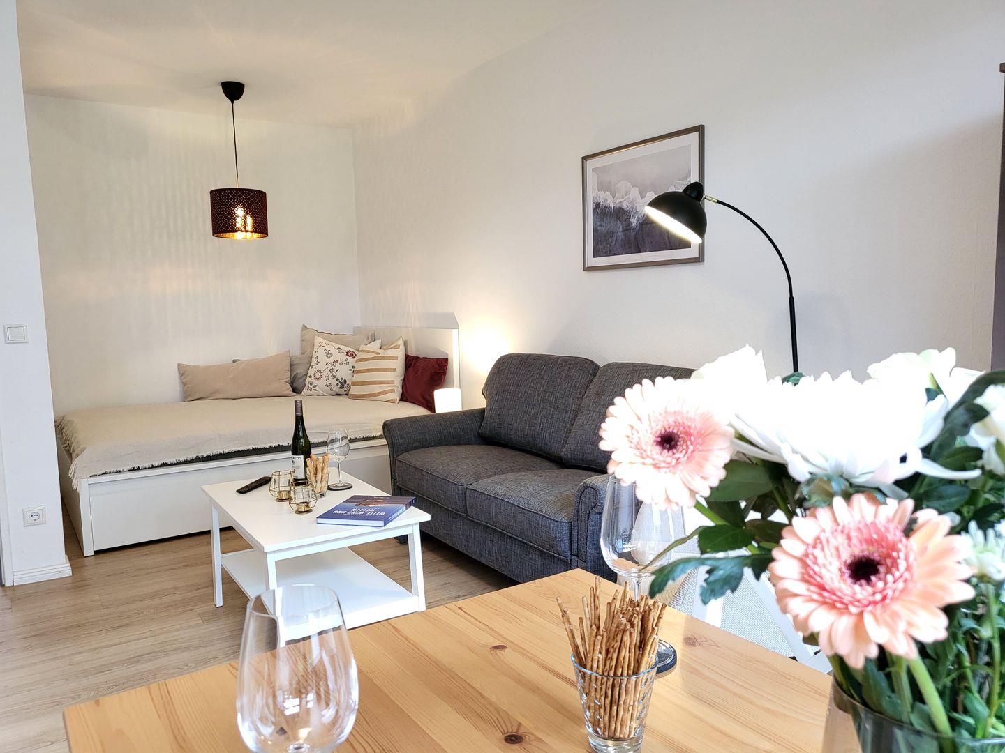 Der großzügige Wohnbereich ist mit einem gemütlichen Sofa, einem Esstisch und einem Smart-TV (Magenta TV) ausgestattet, sodass Sie sowohl entspannen als auch gemeinsame Mahlzeiten genießen können.