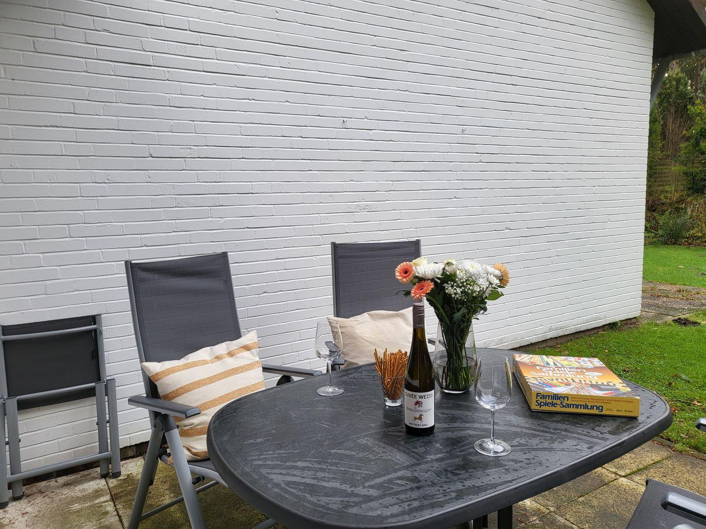 Kleines Reihenhaus mit 2 Zimmern, Terrasse und Gartennutzung, 1 Schlafzimmer mit Doppelbett (160x200), 1 Doppelbett im Wohnraum (140x200), integrierte Küche, Duschbad mit WC, WLAN, Nichtraucher, 1 Hund auf Anfrage gegen Gebühr, eigener PKW-Stellplatz