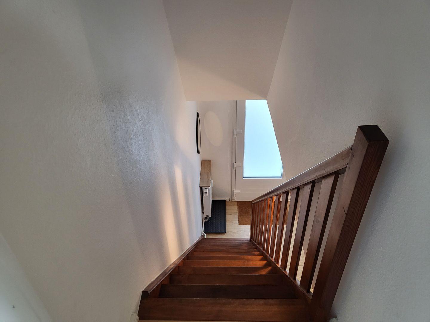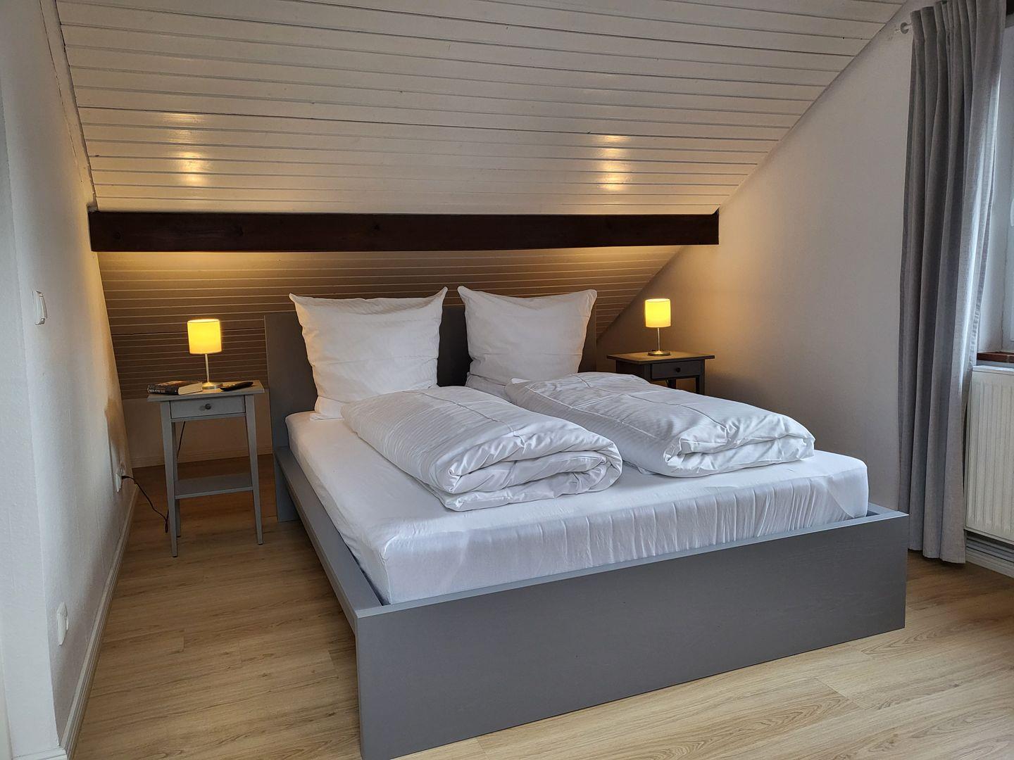 Über eine urige Holztreppe gelangen Sie in das helle Schlafzimmer mit schönen Holzbalken versehen. Das große Schlafzimmer ist mit einem bequemen Bett (160x200), zwei gemütlichen Sesseln, einer Kommode und einem Smart-TV (Magenta TV) ausgestattet.