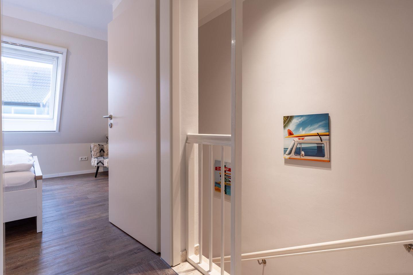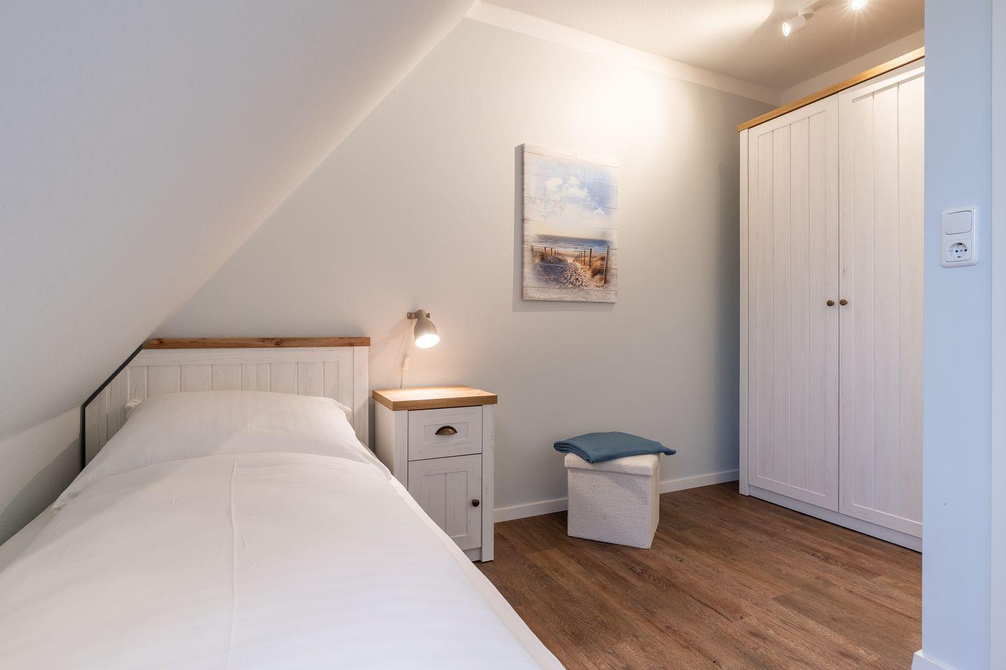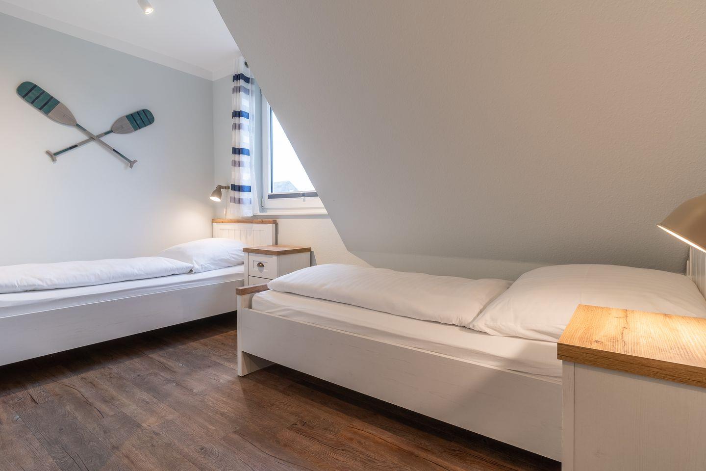 Obergeschoss: 2 Schlafräume (1 Doppelbett + TV, 2 Einzelbetten).