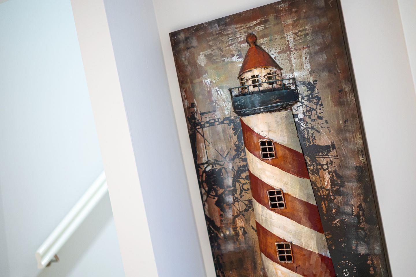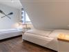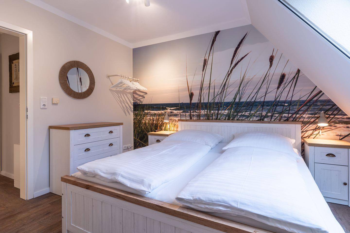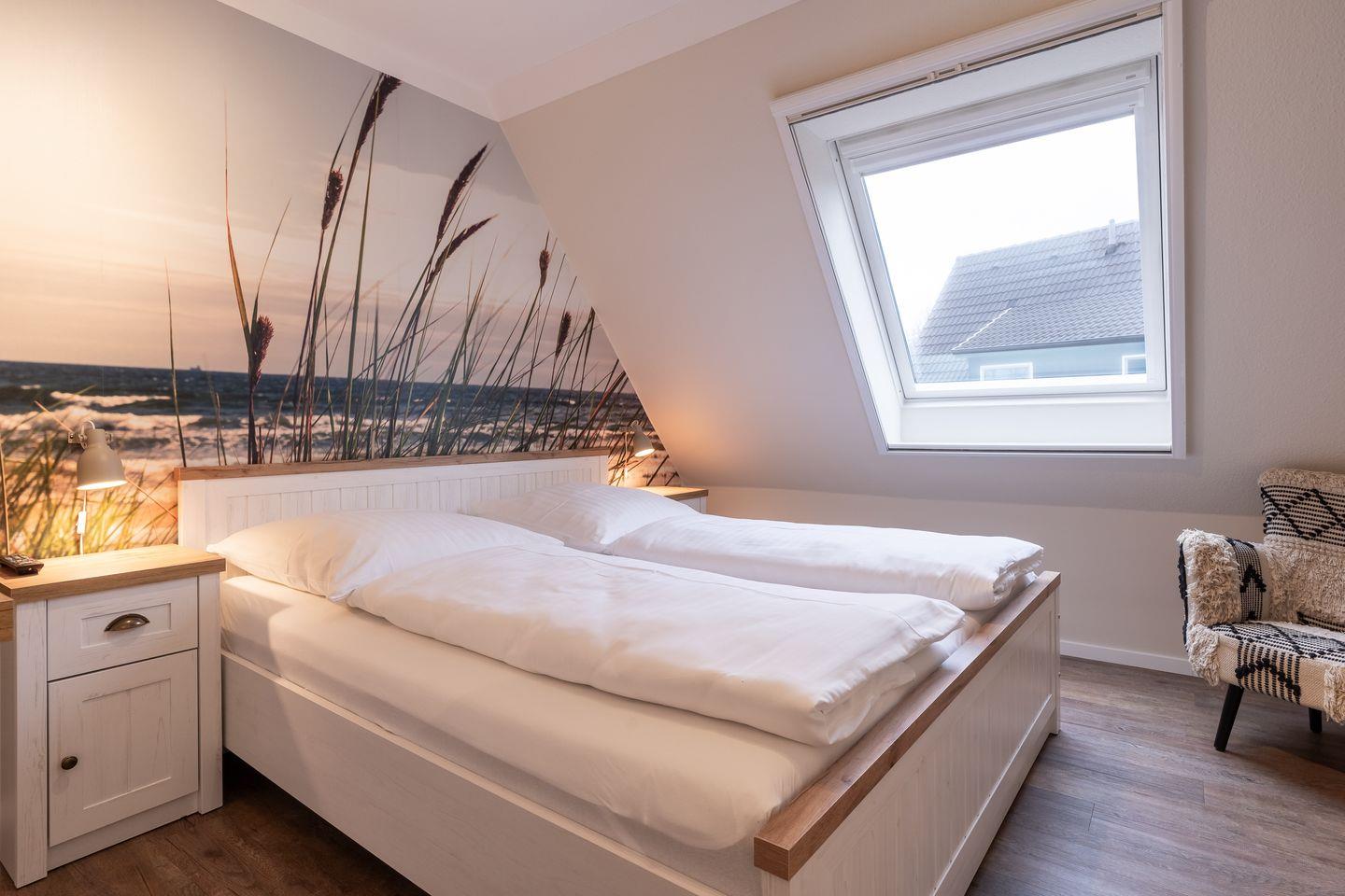Obergeschoss: 2 Schlafräume (1 Doppelbett + TV, 2 Einzelbetten).