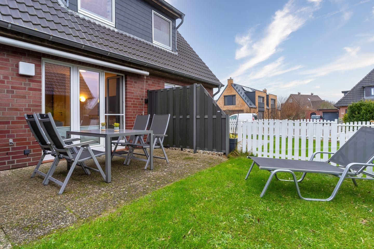Möblierte Terrasse mit Sonnenliege. Ein PKW-Stellplatz am Haus ist für Sie reserviert.