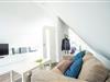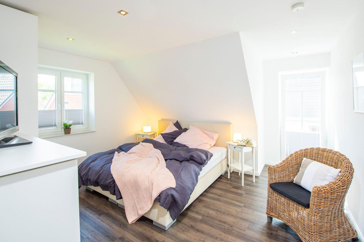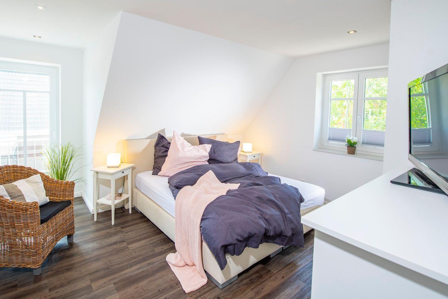 Im Spitzboden im 2. Obergeschoss erwartet Sie ein weiters Schlafzimmer mit einem Boxspringbetten (140 x 200 cm) und einer gemütlichen Sitzecke mit Sofa und Fernseher.