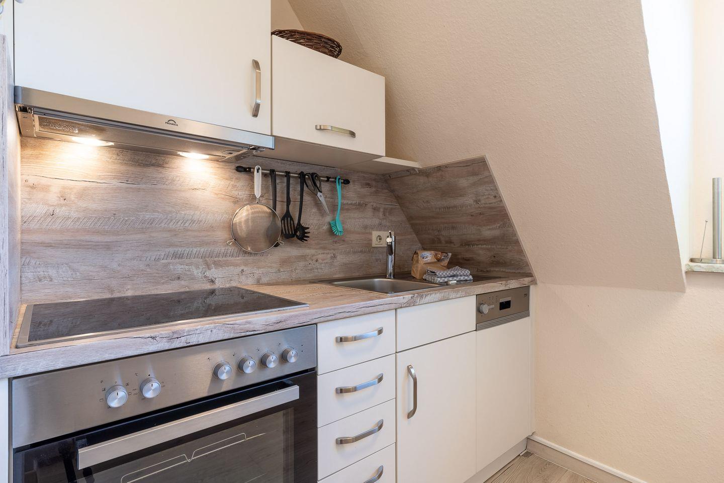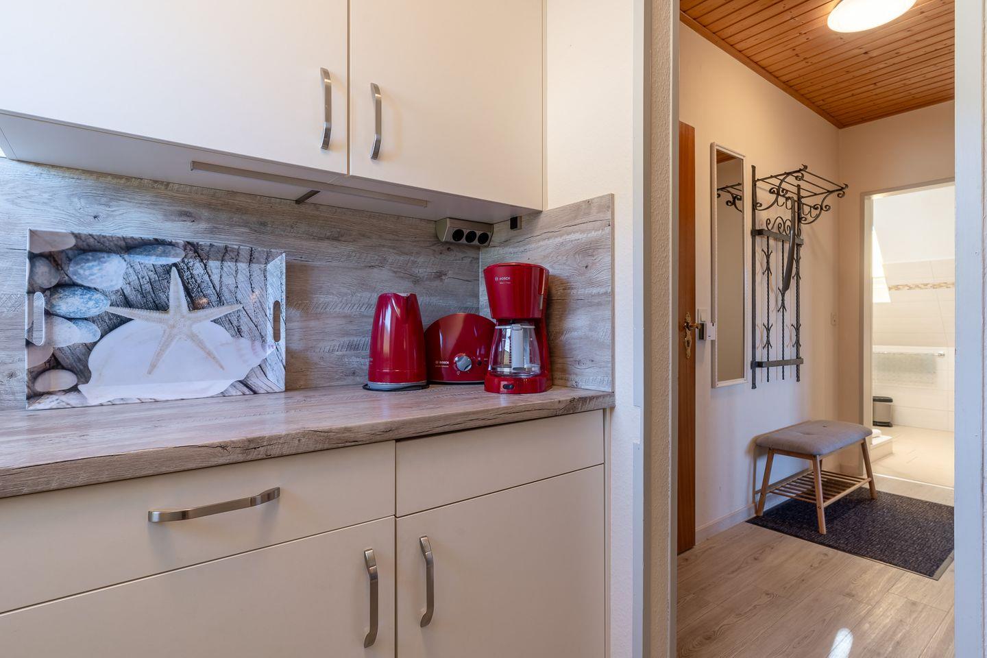 • Küche: Separate, voll ausgestattete Küche mit Geschirrspüler, 4-Platten-Cerankochfeld, Backofen, Kühlschrank mit Gefrierfach, Kaffeemaschine, Toaster und Wasserkocher – ideal für kulinarische Abende.