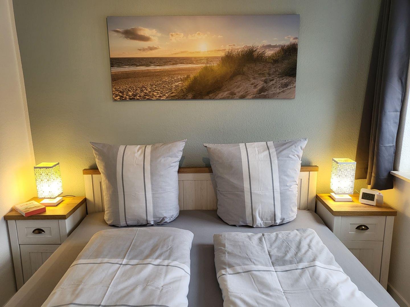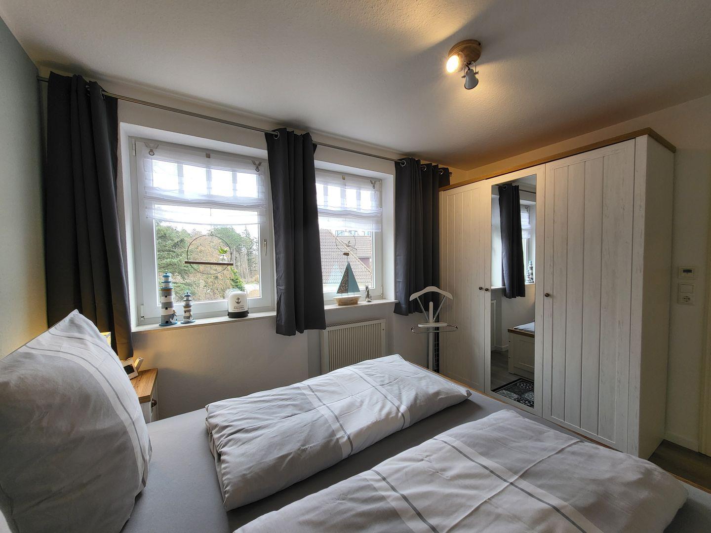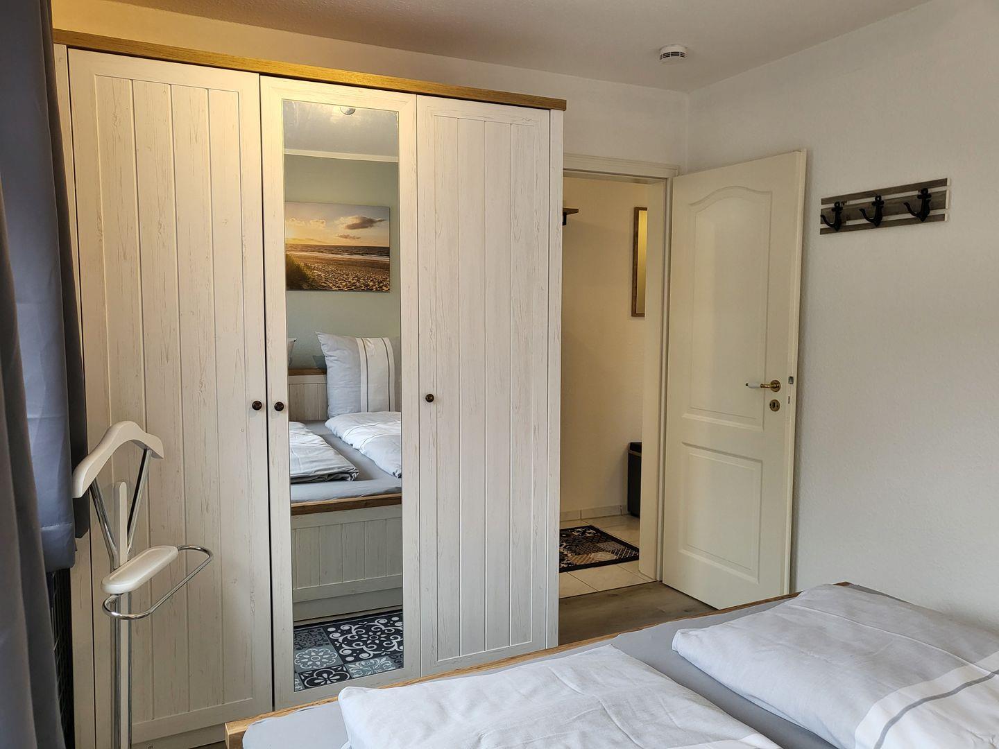 Es gibt einen kleinen Flur mit Garderobe, einer Kommode und ein separates Schlafzimmer mit Doppelbett (180 x 200) und einem Kleiderschrank.