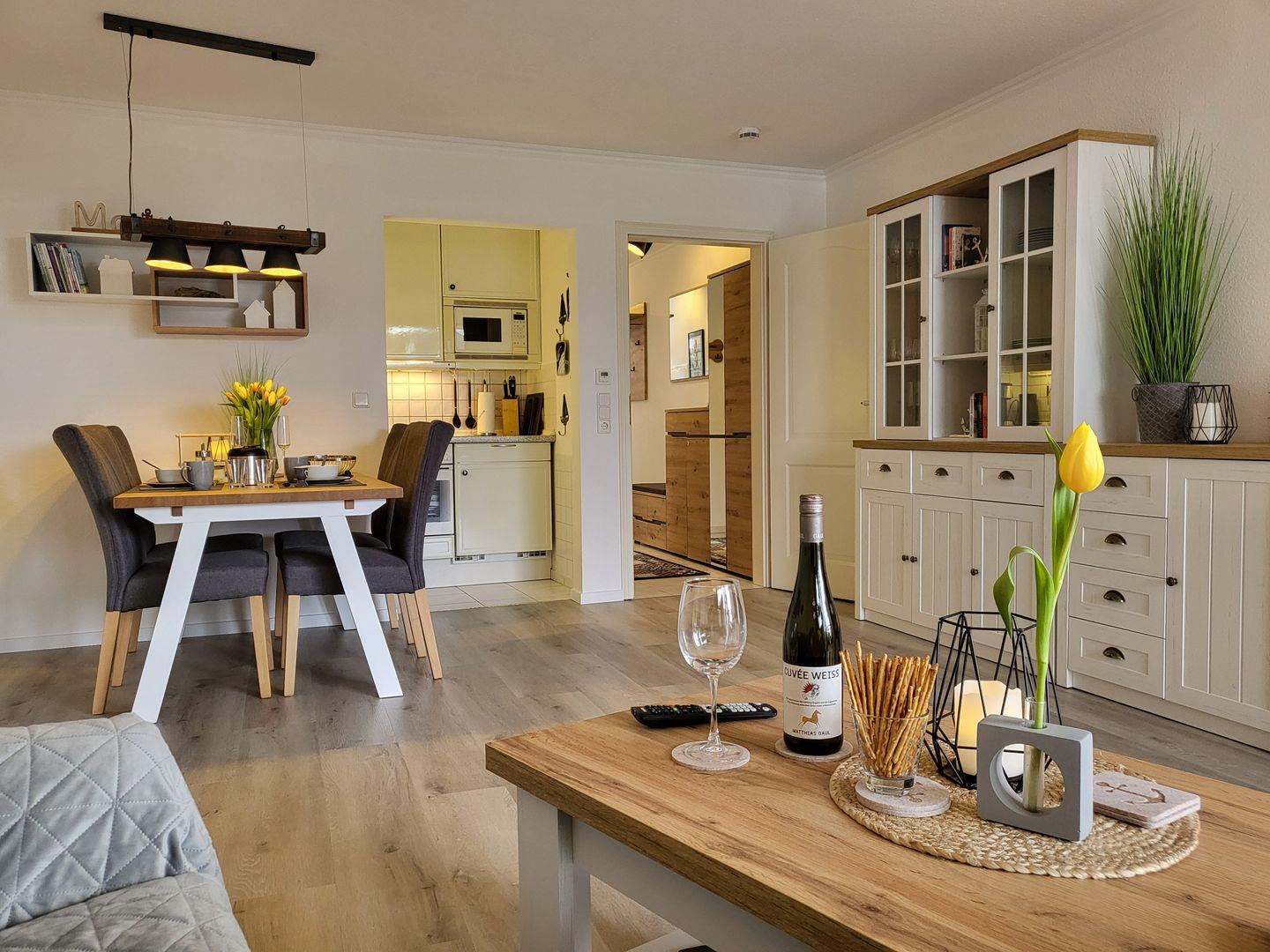 Der Wohnraum bietet eine gemütliche Eckgarnitur mit Schlaffunktion, einem Smart-TV und der große Esstisch mit 4 Plätzen ist vor der Küchenzeile.