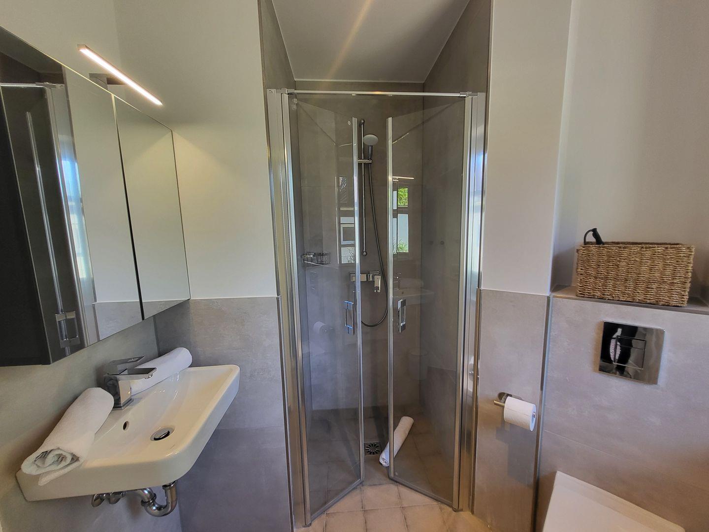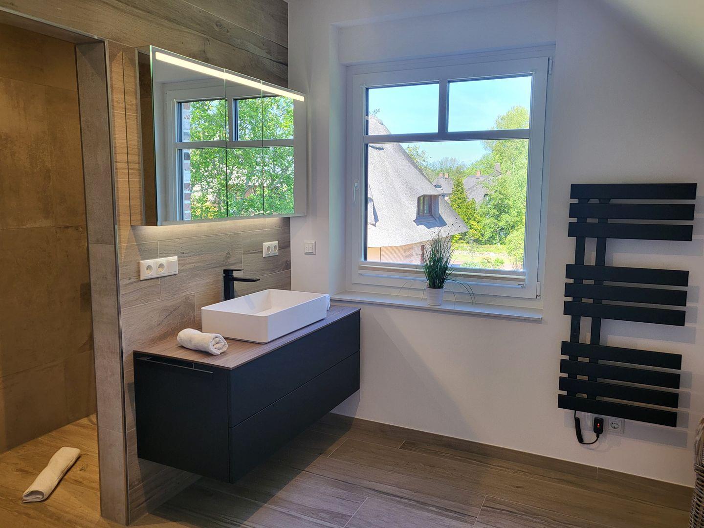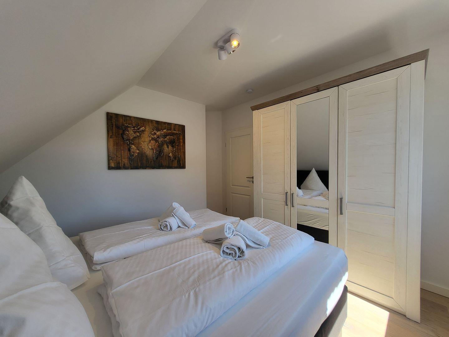 Die beiden stilvollen Schlafzimmer im Obergeschoß sind mit modernen Möbeln, Boxspringbetten (180 x 200) und Parkettboden ausgestattet, und bieten einen angenehmen Rückzugsort nach einem aktiven Tag am Strand. Die beiden Badezimmer verfügen über bodengleiche Duschen, Waschbecken, WC und komfortable Spiegel, während ein Haartrockner für Ihren Komfort bereitsteht. Kostenloses WLAN und zwei Smart-TV´s sorgen dafür, dass Sie auch bei schlechtem Wetter gut unterhalten werden.