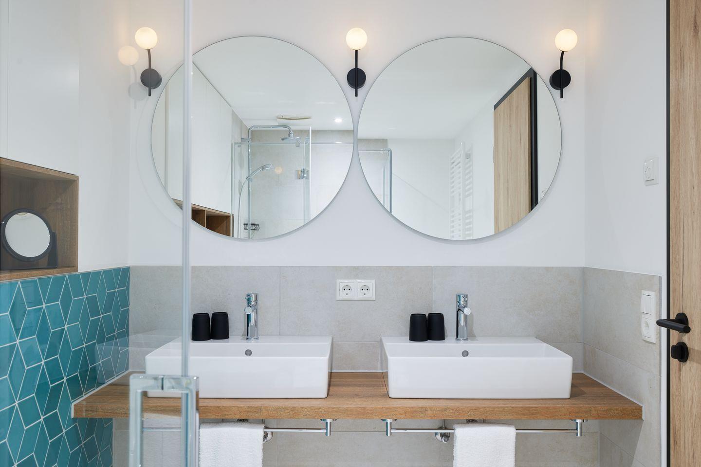 Ein separates Schlafzimmer mit bequemem Boxspringbett bietet Raum für ruhige Momente. Es besteht eine weitere Schlafmöglichkeit für bis zu 2 Personen. Das moderne Badezimmer verfügt über eine ebenerdige Dusche.