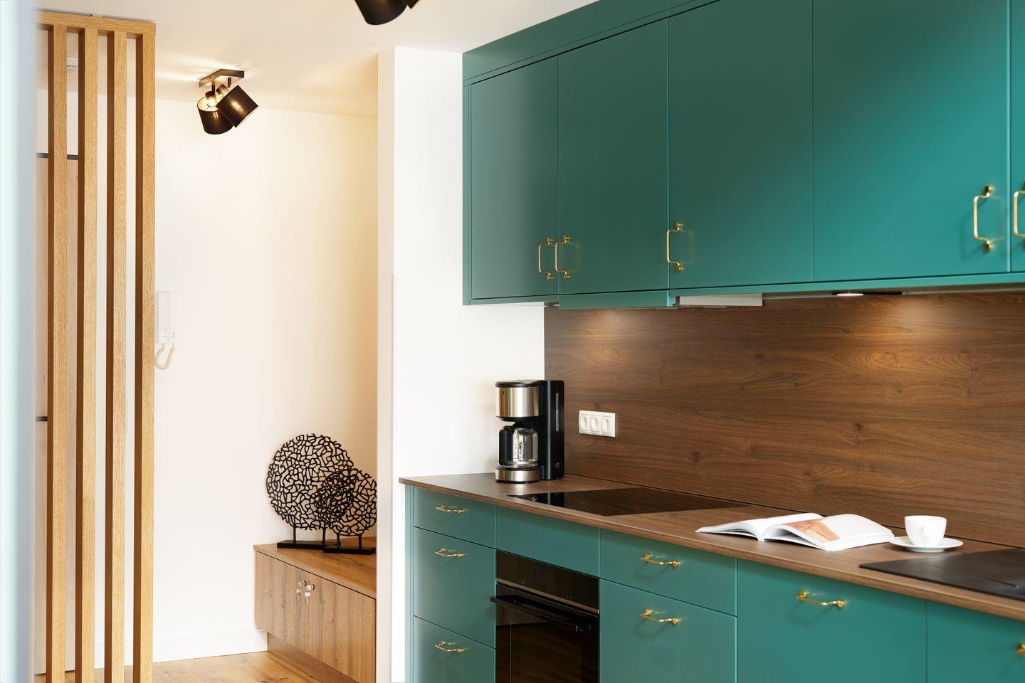 Die einzigartige Ausstattung des ca. 73 m² großen Apartments schafft ein großzügiges Wohngefühl. Der Wohn- und Essbereich mit integrierter Küche und Design-Polstermöbeln lädt zum gemütlichen Zusammensein ein und grenzt direkt an Ihren privaten Balkon. Ein Highlight ist die hochwertige Küche mit türkisenen Fronten und goldenen Armaturen.