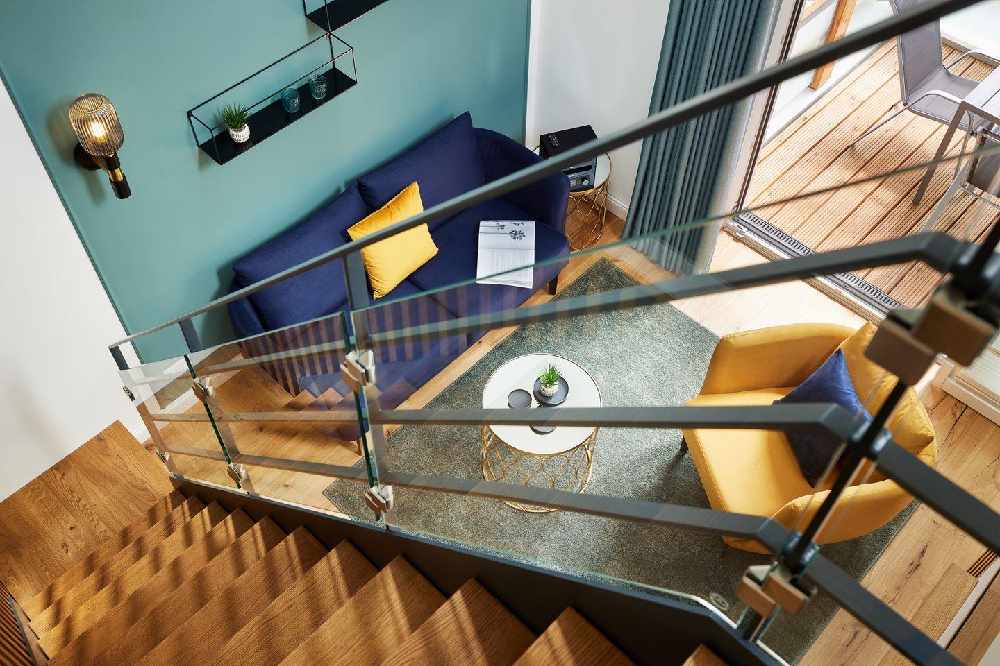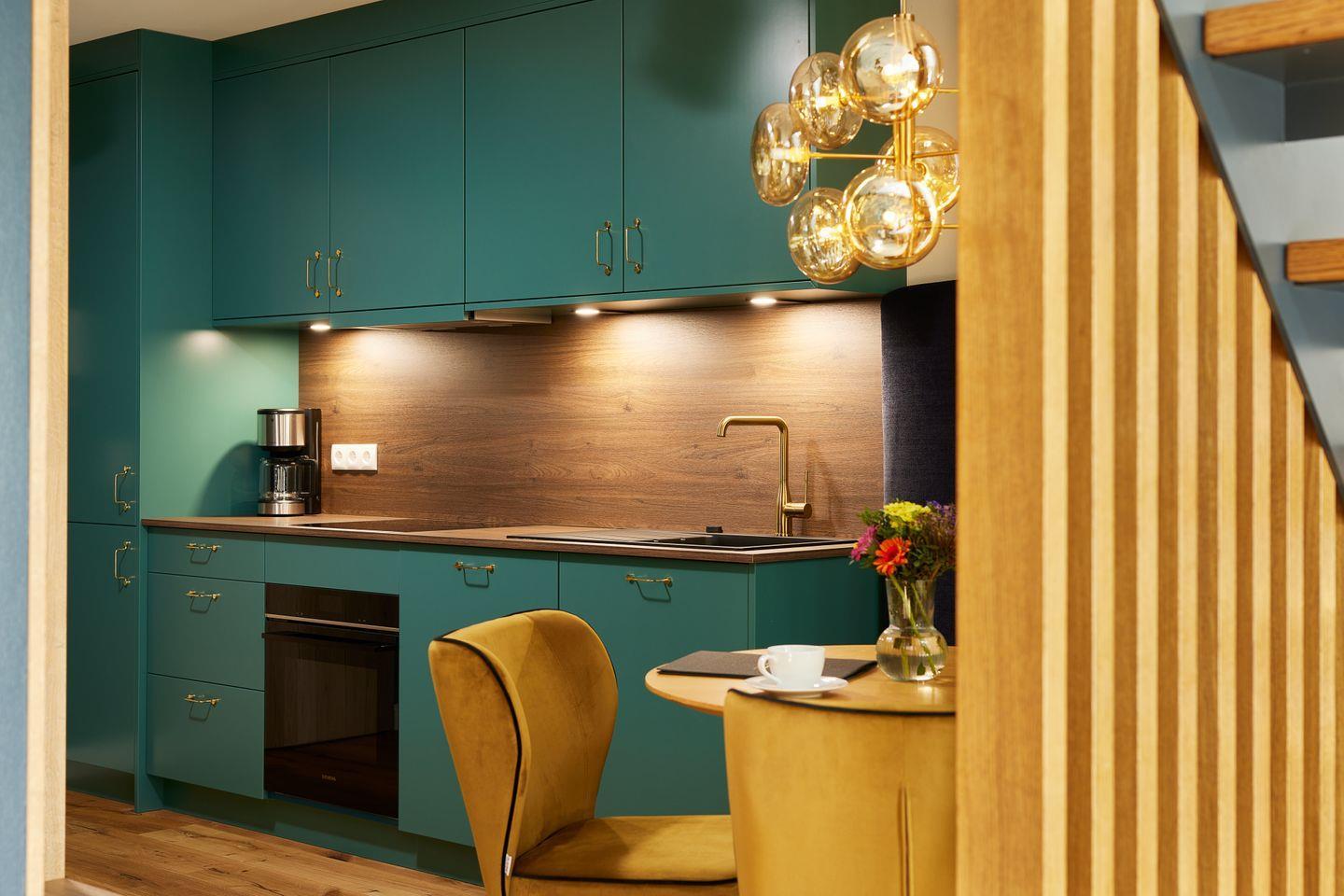 Die offene Konzeption des ca. 73 m² großen 1-Zimmer-Apartments schafft ein einzigartiges Wohngefühl und bietet Platz für bis zu zwei Gäste. Der Wohn- und Essbereich mit integrierter Küche und Design-Polstermöbeln lädt zum gemütlichen Zusammensein ein und grenzt direkt an Ihren privaten Sonnenbalkon. Nicht nur die hochwertige Küche mit türkisfarbenen Fronten und goldenen Armaturen ist ein Highlight: Über dem Wohnraum befindet sich eine große Galerie, die zum Entspannen einlädt.