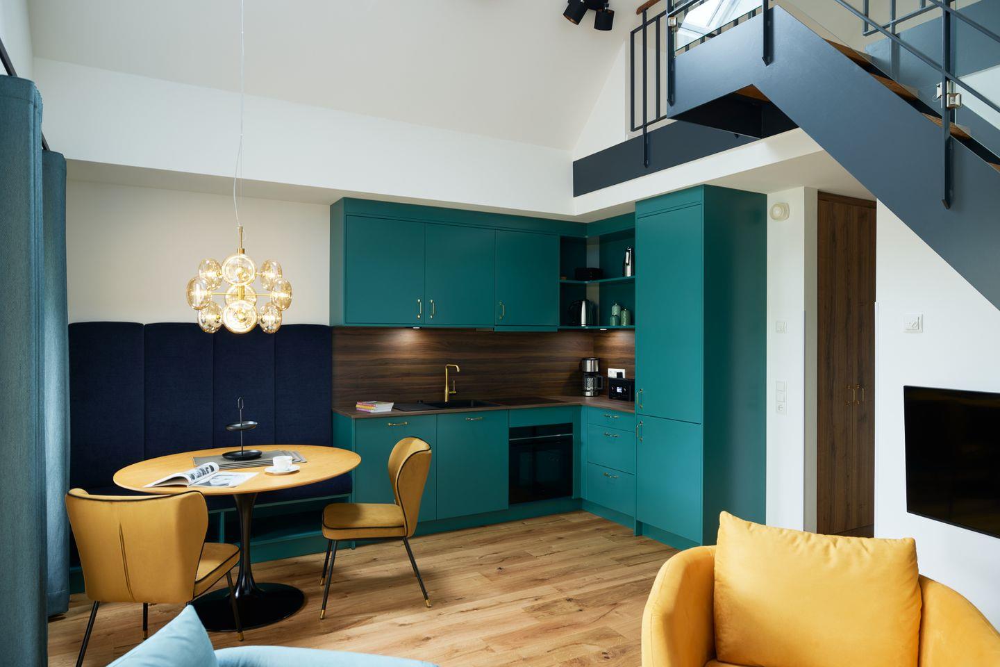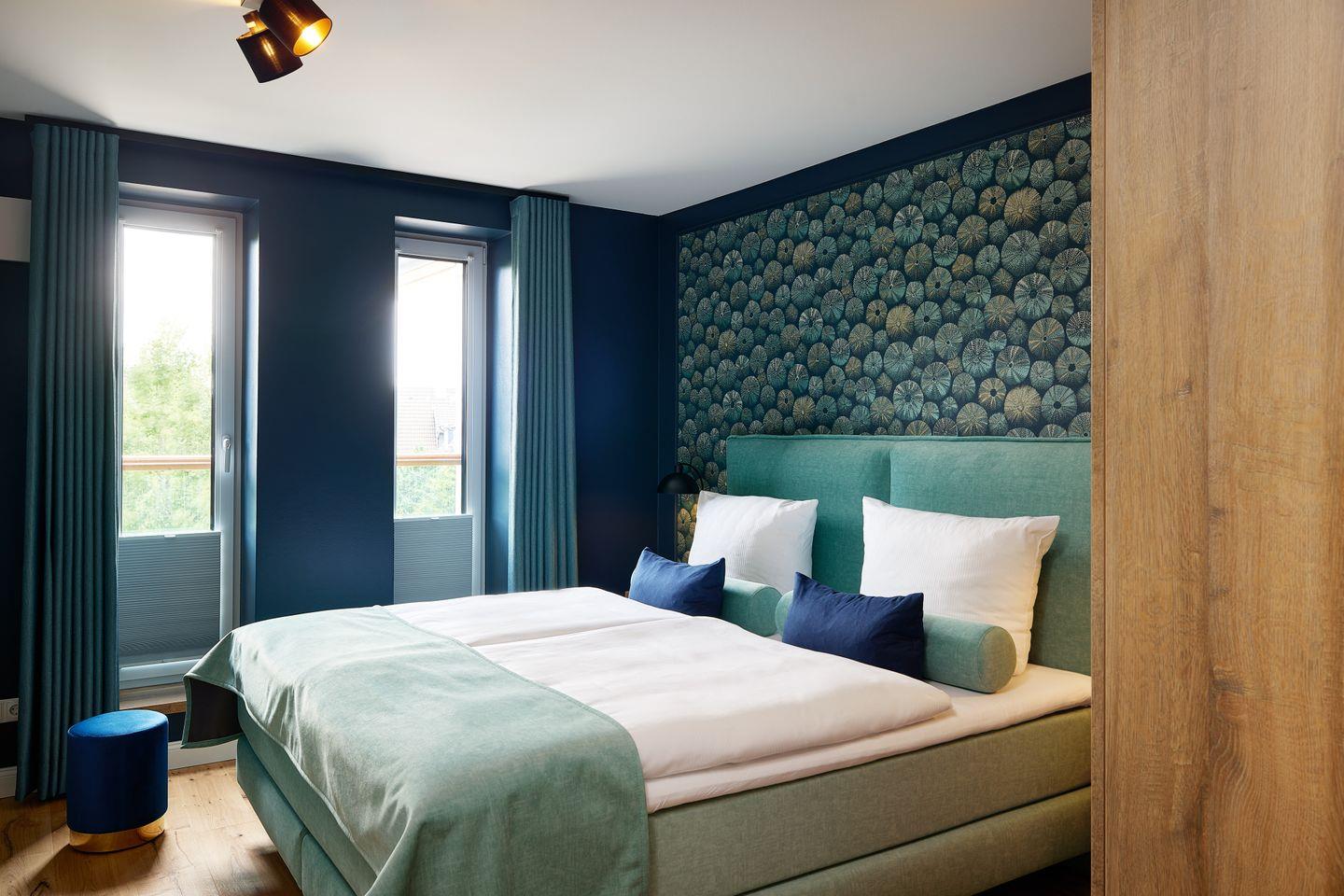 Mit ca. 90 m² und einer hochwertigen Ausstattung ist dieses Apartment ein wunderbarer Rückzugsort an der Küste. Der Wohn- und Essbereich mit integrierter Küche und Design-Polstermöbeln lädt zum gemütlichen Zusammensein ein und grenzt direkt an Ihre große, ganz private Loggia. Ein weiteres Highlight ist die hochwertige Küche mit türkisfarbenen Fronten und goldenen Armaturen – stilvoll und maritim. Vom Wohnbereich aus gelangen Sie über eine Treppe auf die offene Galerie, die zum Entspannen einlädt. Zwei Schlafzimmer mit bequemen Boxspringbetten bieten Platz für vier Gäste. Die exklusive Ausstattung wird durch zwei moderne Badezimmer mit begehbarer Dusche abgerundet.