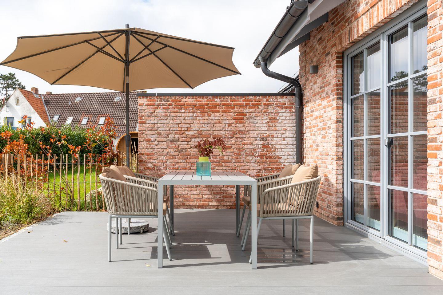 Die Terrasse im eingezäunten Garten lädt zum Entspannen ein und bietet die Möglichkeit, die frische Nordseeluft zu genießen. Ein Sichtschutz garantiert Ihnen Privatsphäre. Zudem steht Ihnen auch ein Gartenhaus zur Verfügung, wo Sie Ihre E-Bikes sicher verschließen und kostenfrei laden können.
