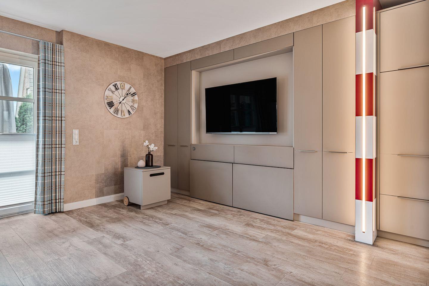 Der einladende Wohnbereich überzeugt mit einer gemütlichen Essecke und einem hochwertigen Ledersofa mit elektrischer Relaxfunktion – ideal für entspannte Abende zu zweit. Ein clever integriertes Belitec-Schrankbett verwandelt den Raum bei Bedarf in ein behagliches Schlafzimmer. Tagsüber lässt sich das Bett dezent im Schrank verstauen, wodurch ein großzügiges Wohnambiente entsteht.