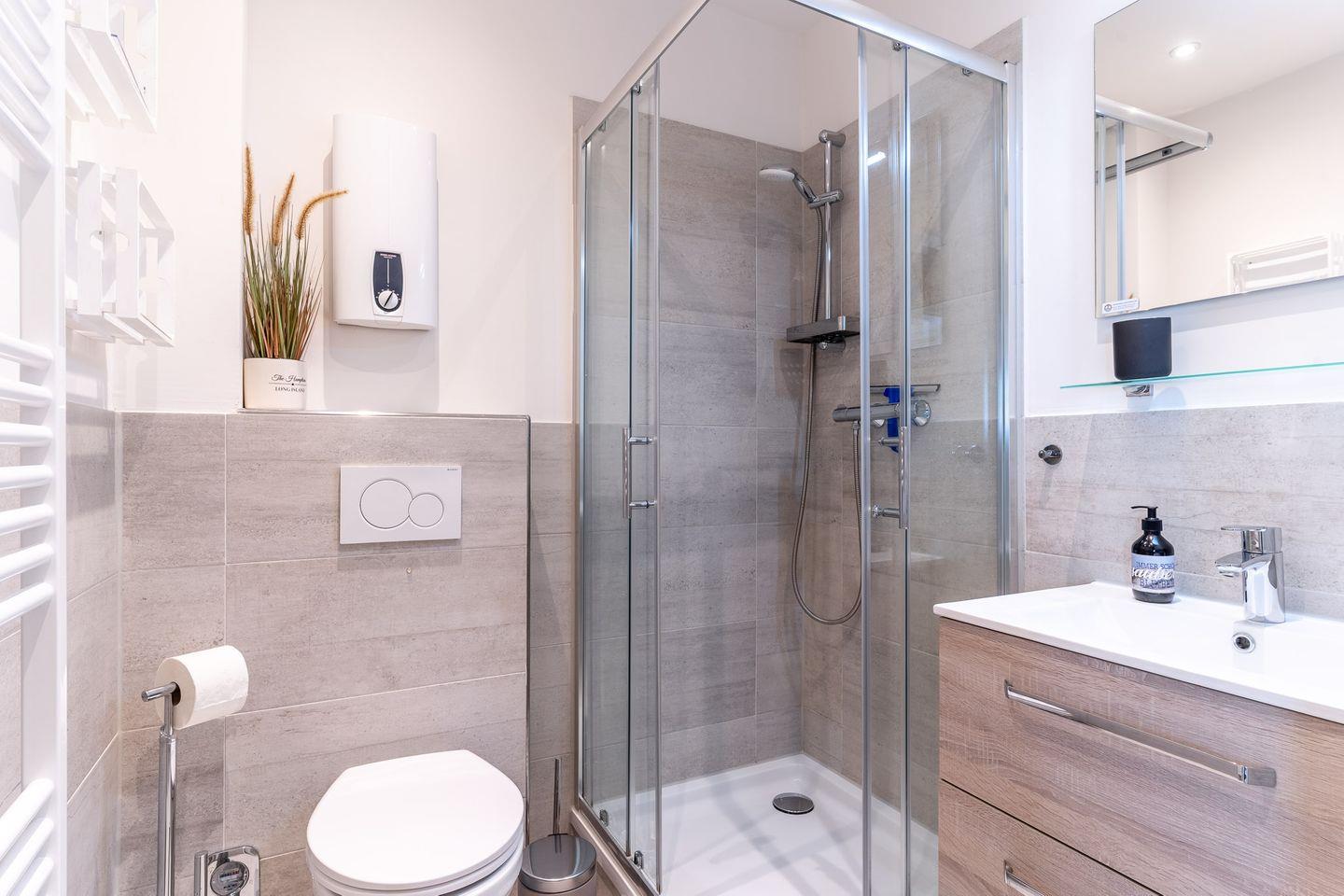 Das moderne Duschbad bietet eine komfortable Dusche, WC, Handtuchwärmer und Föhn – alles für einen entspannten Start in den Tag.