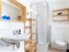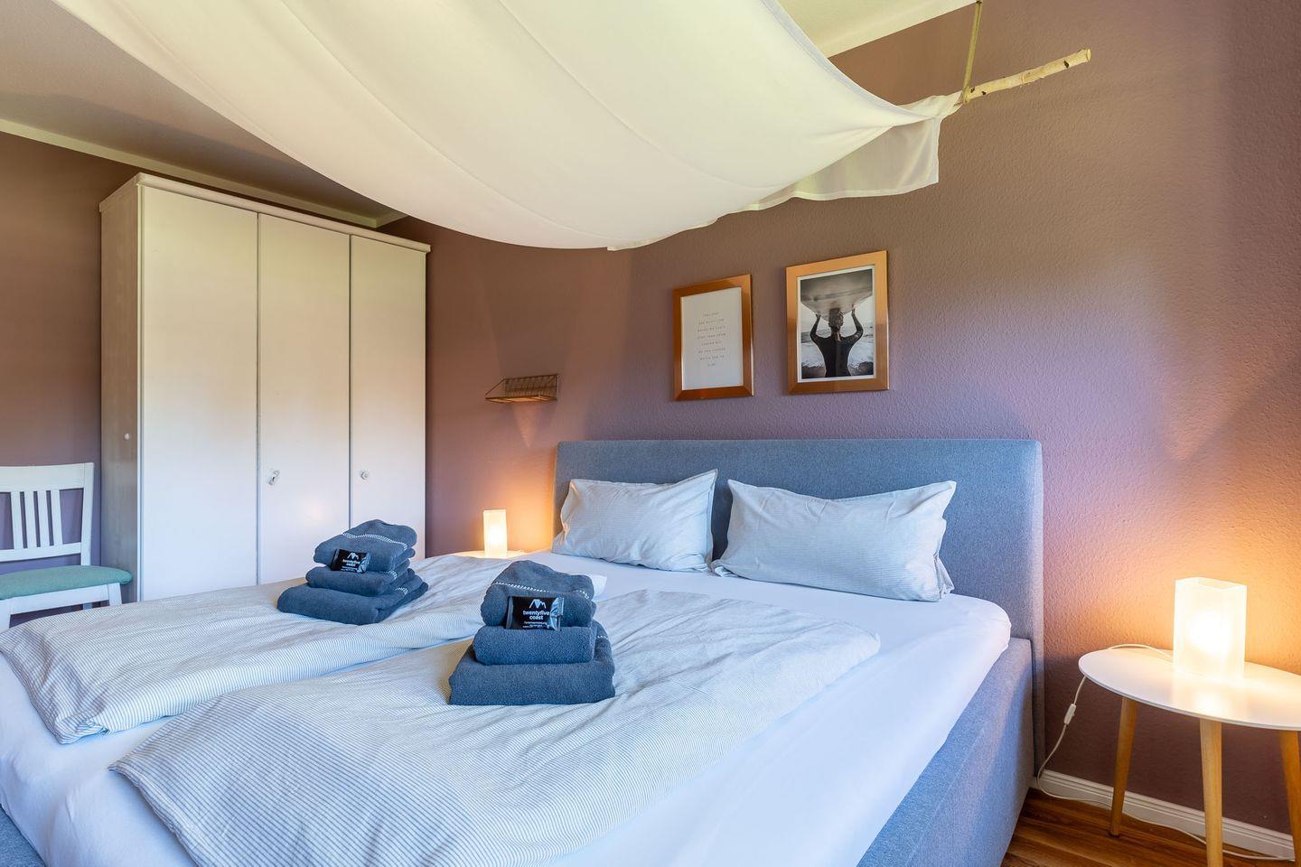 Im separaten Schlafzimmer erwartet Sie ein gemütliches Doppelbett (135x200 cm) mit synthetischer Bettdecke und Kissen. Das moderne Tageslichtbad bietet eine Dusche mit hohem Einstieg, WC, Föhn und ausreichend Ablagefläche.