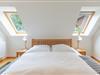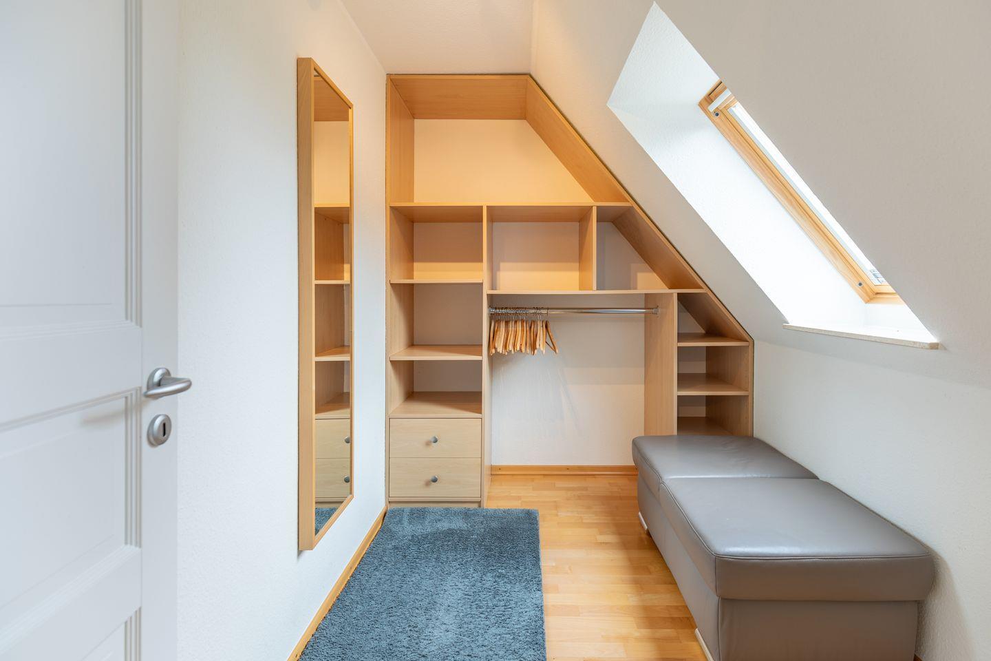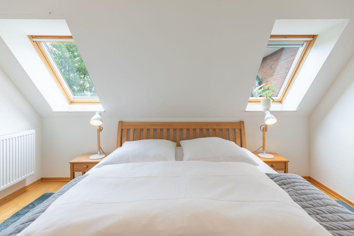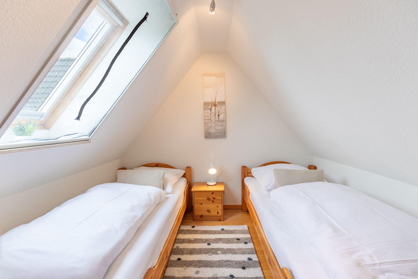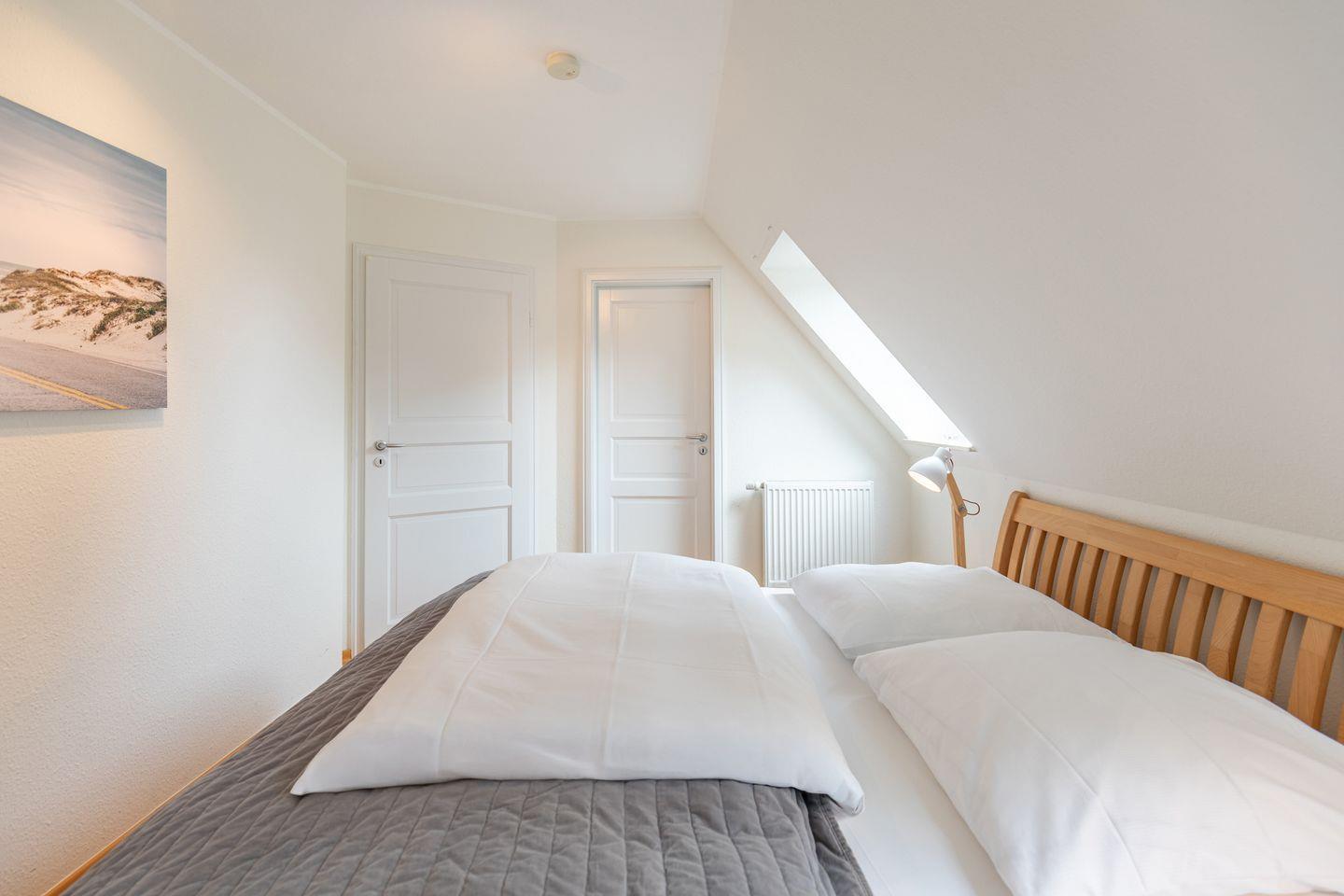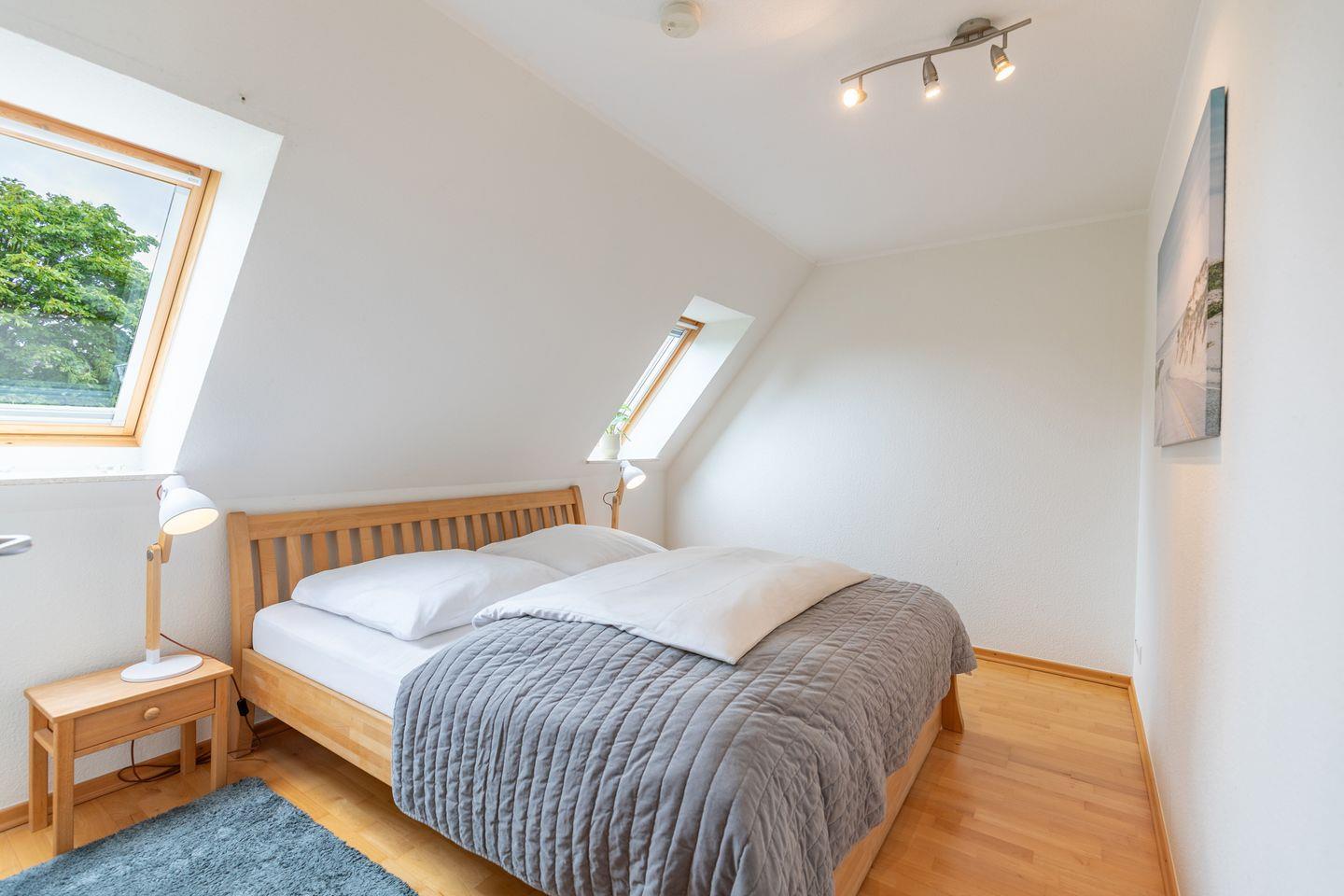 Das erste Schlafzimmer ist mit einem Doppelbett (180 x 200 cm) ausgestattet und bietet dank seiner beiden Dachfenster viel Helligkeit. Ein Nachttisch mit Leselampe auf jeder Seite sorgt für Komfort, sodass Sie auch abends entspannt lesen können. Der Raum ist schlicht und freundlich eingerichtet und bietet einen erholsamen Rückzugsort nach einem Tag an der Nordsee. Angrenzend an das Schlafzimmer befindet sich ein separates Ankleidezimmer. Hier stehen Ihnen offene Regale, eine Kleiderstange sowie Schubladen für Ihre Urlaubsgarderobe zur Verfügung. Ein großer Spiegel und eine kleine Sitzbank runden die Ausstattung ab und sorgen für zusätzlichen Komfort.