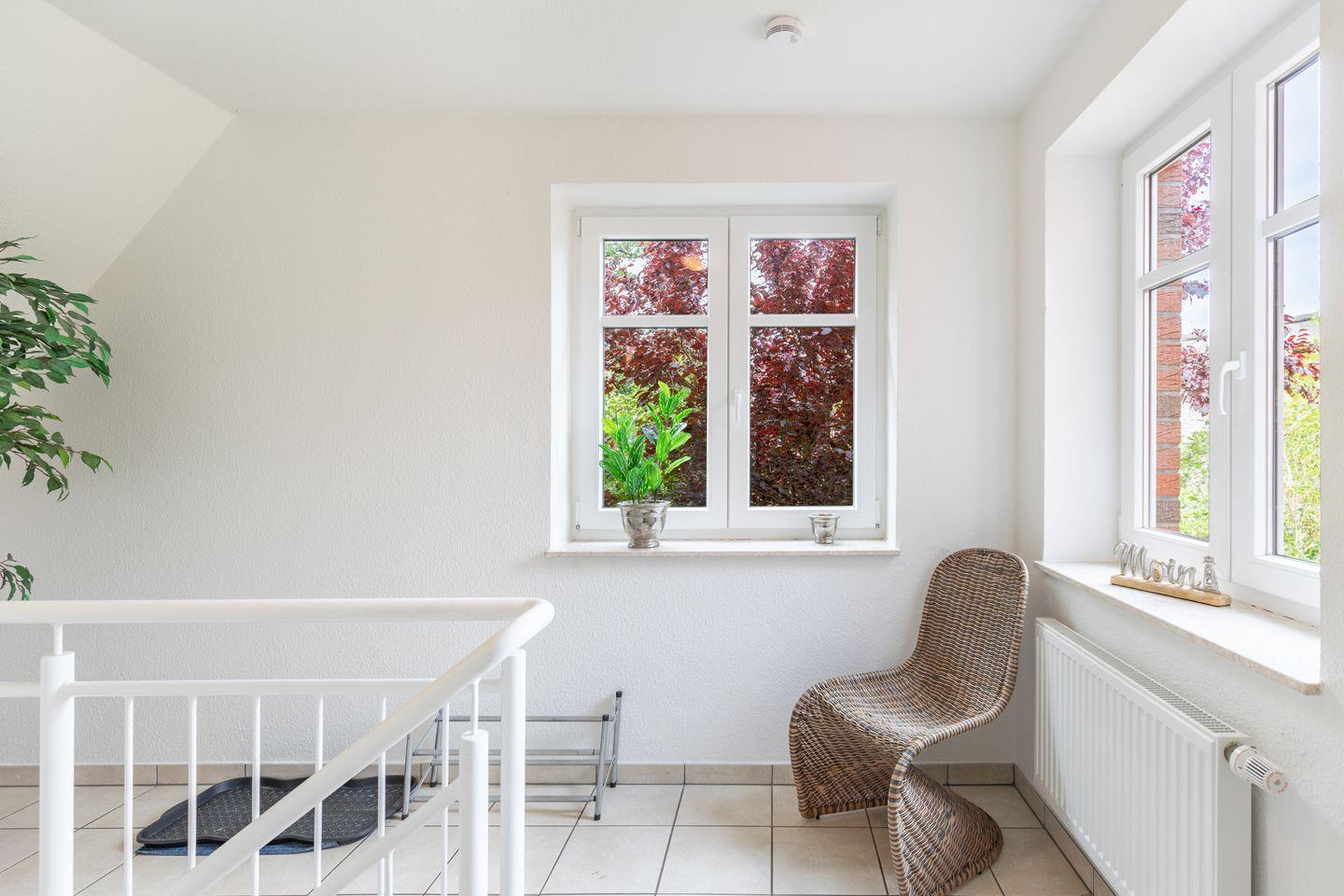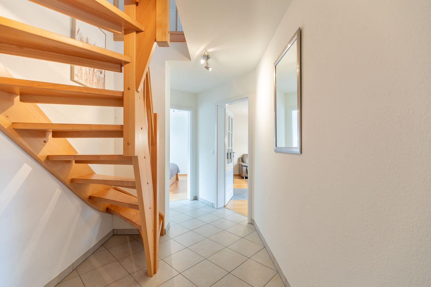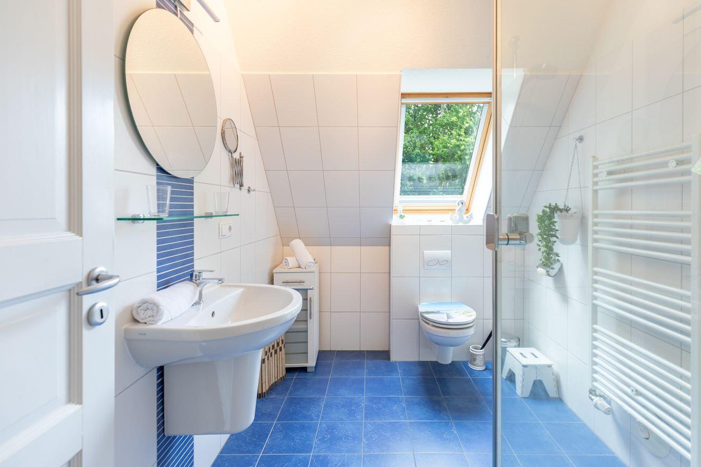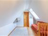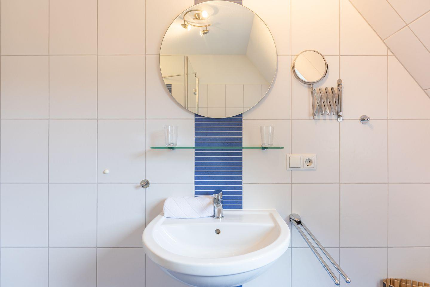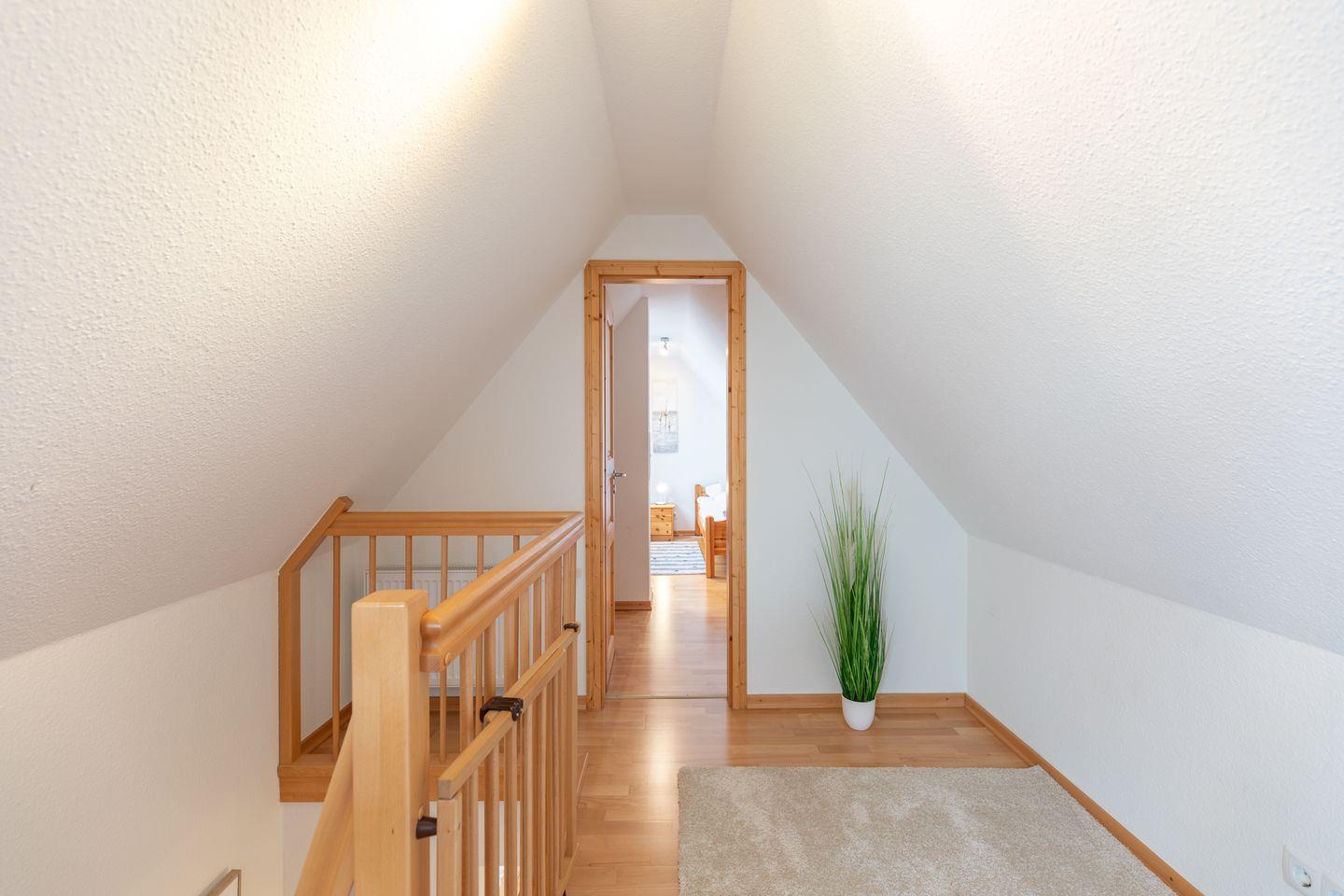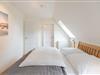Das erste Schlafzimmer ist mit einem Doppelbett (180 x 200 cm) ausgestattet und bietet dank seiner beiden Dachfenster viel Helligkeit. Ein Nachttisch mit Leselampe auf jeder Seite sorgt für Komfort, sodass Sie auch abends entspannt lesen können. Der Raum ist schlicht und freundlich eingerichtet und bietet einen erholsamen Rückzugsort nach einem Tag an der Nordsee. Angrenzend an das Schlafzimmer befindet sich ein separates Ankleidezimmer. Hier stehen Ihnen offene Regale, eine Kleiderstange sowie Schubladen für Ihre Urlaubsgarderobe zur Verfügung. Ein großer Spiegel und eine kleine Sitzbank runden die Ausstattung ab und sorgen für zusätzlichen Komfort.