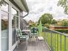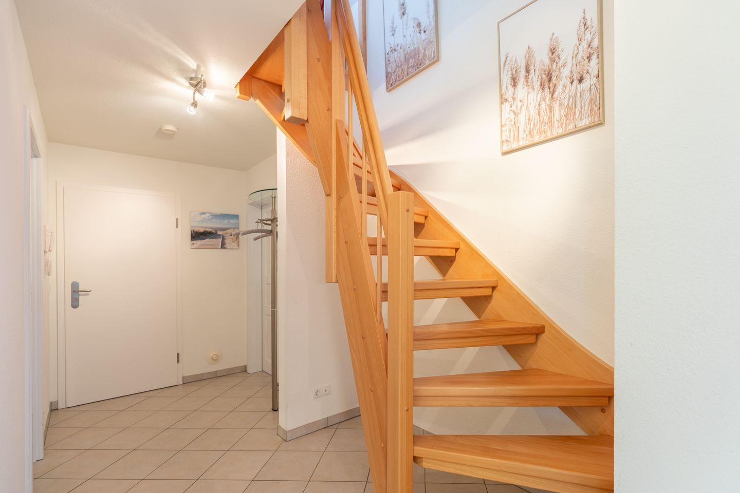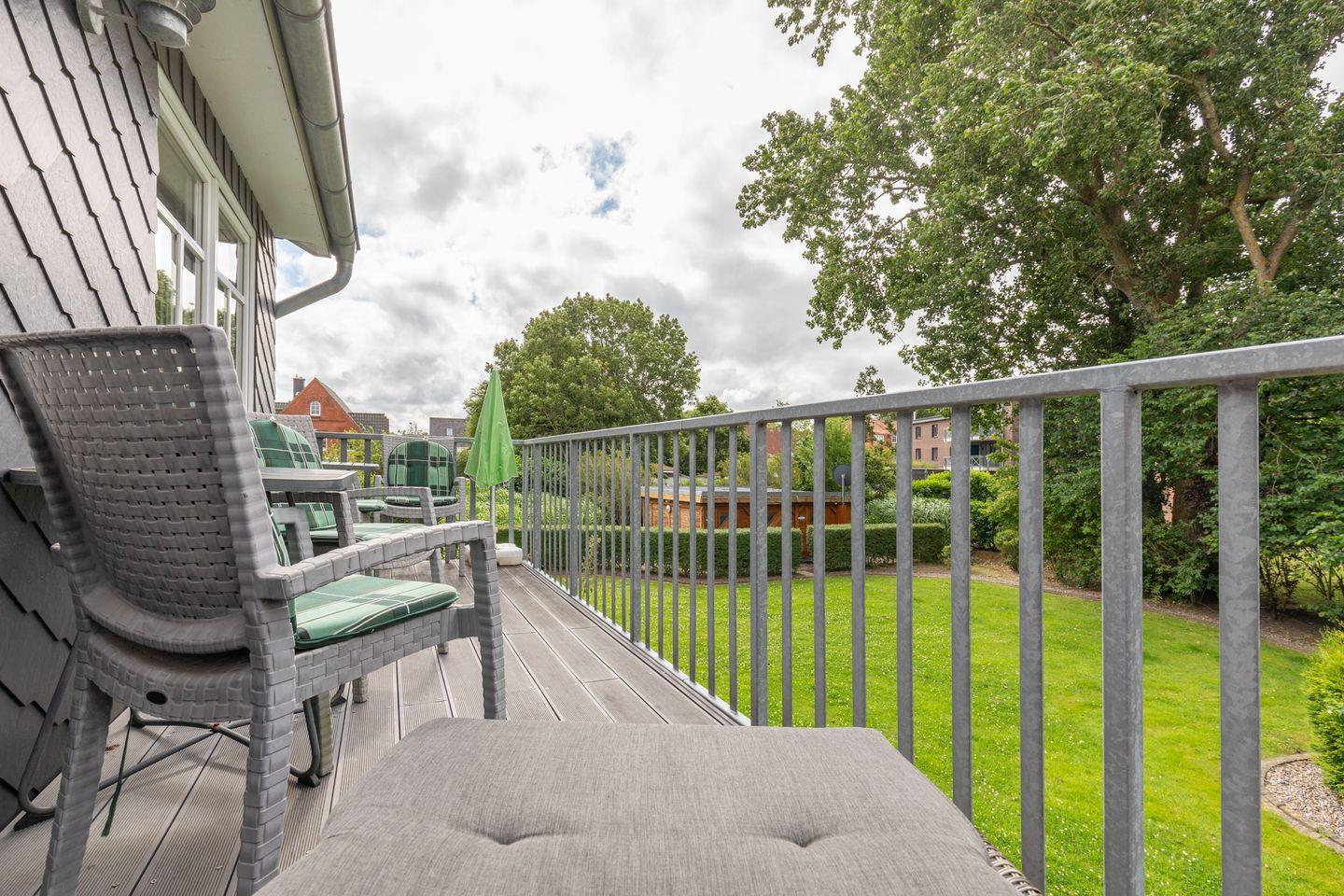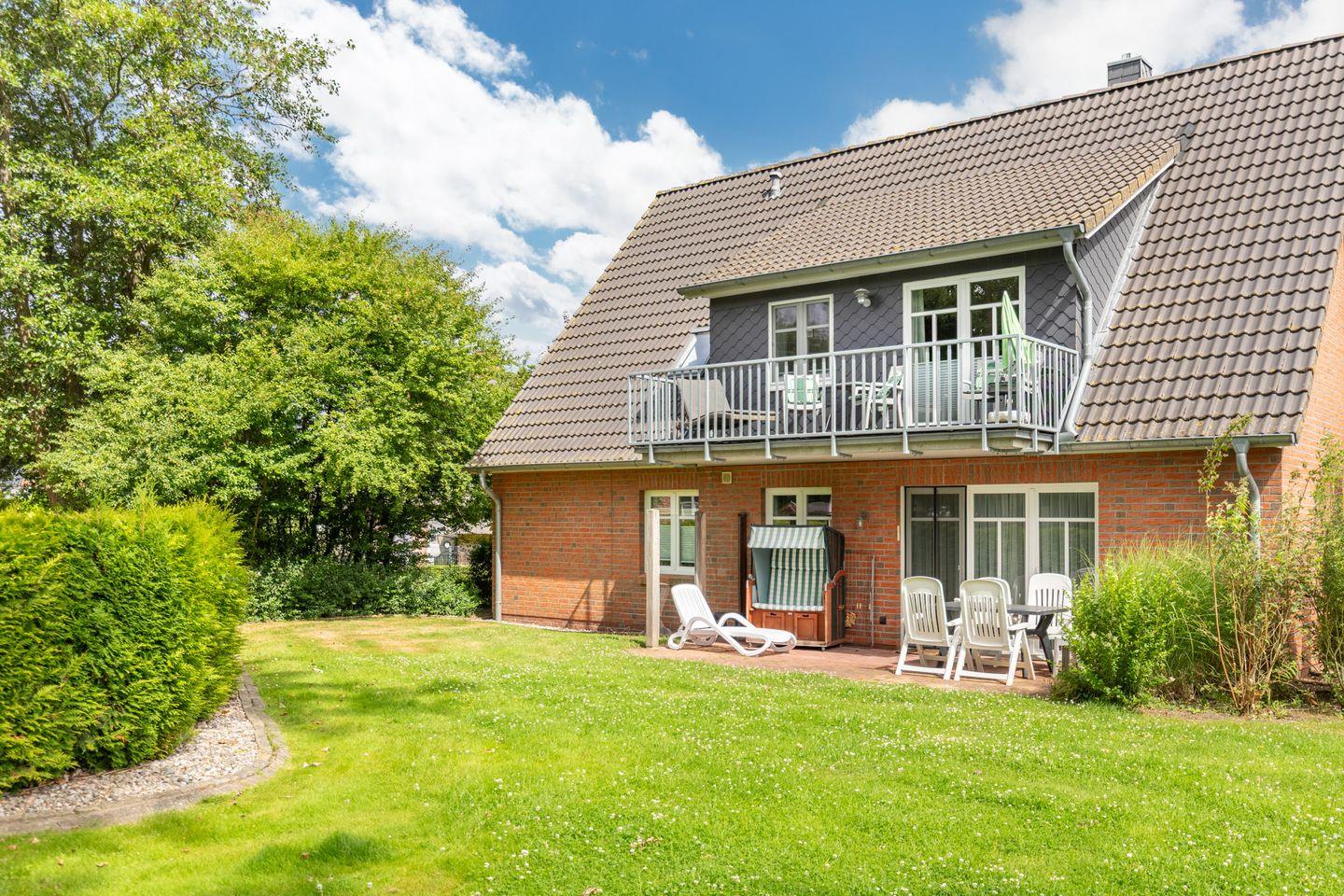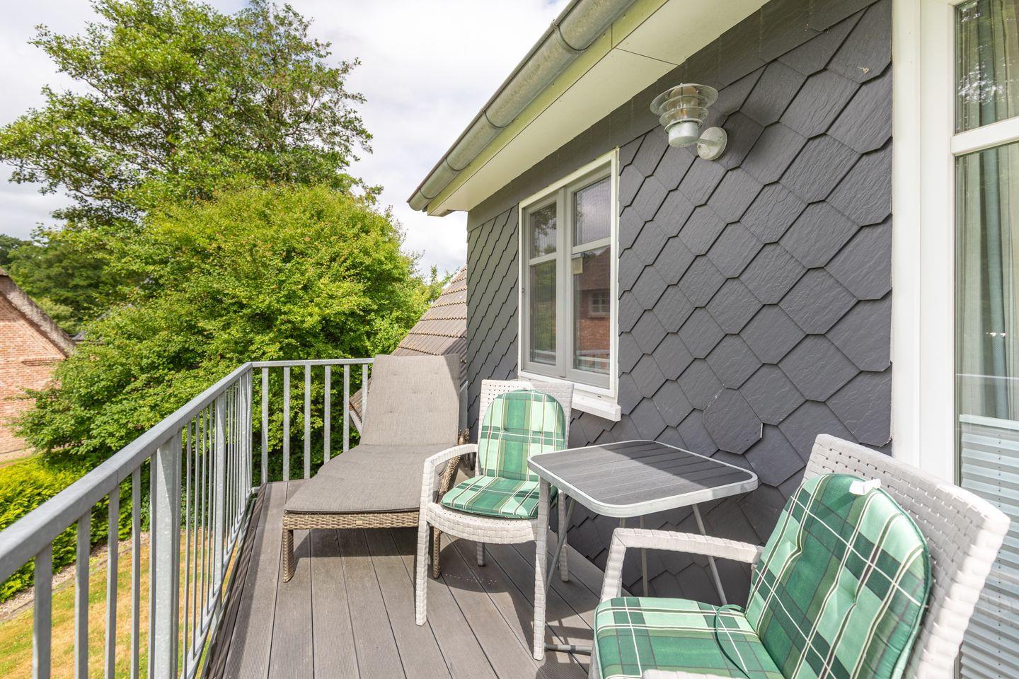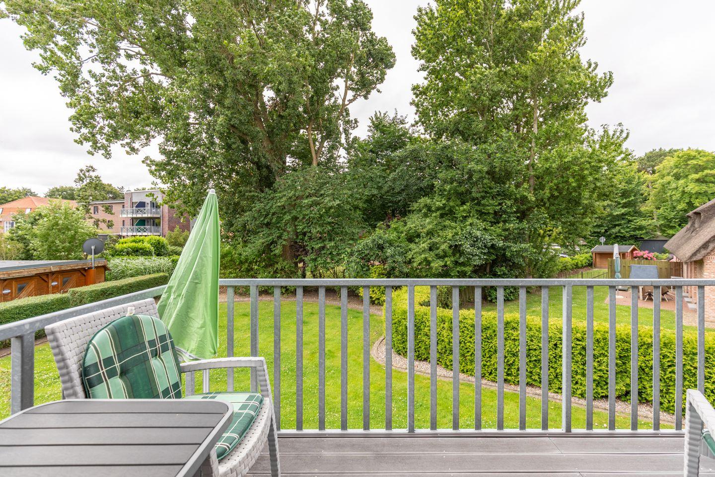 Vom Wohn- und Essbereich gelangen Sie direkt auf den möblierten Balkon. Hier stehen Sitzgelegenheiten, ein Tisch sowie eine Sonnenliege zur Verfügung, sodass Sie entspannte Stunden im Freien genießen können. Der Blick ins Grüne sorgt für Ruhe und Erholung, während Sie die frische Nordseeluft und sonnige Tage bequem direkt an der Wohnung verbringen können.