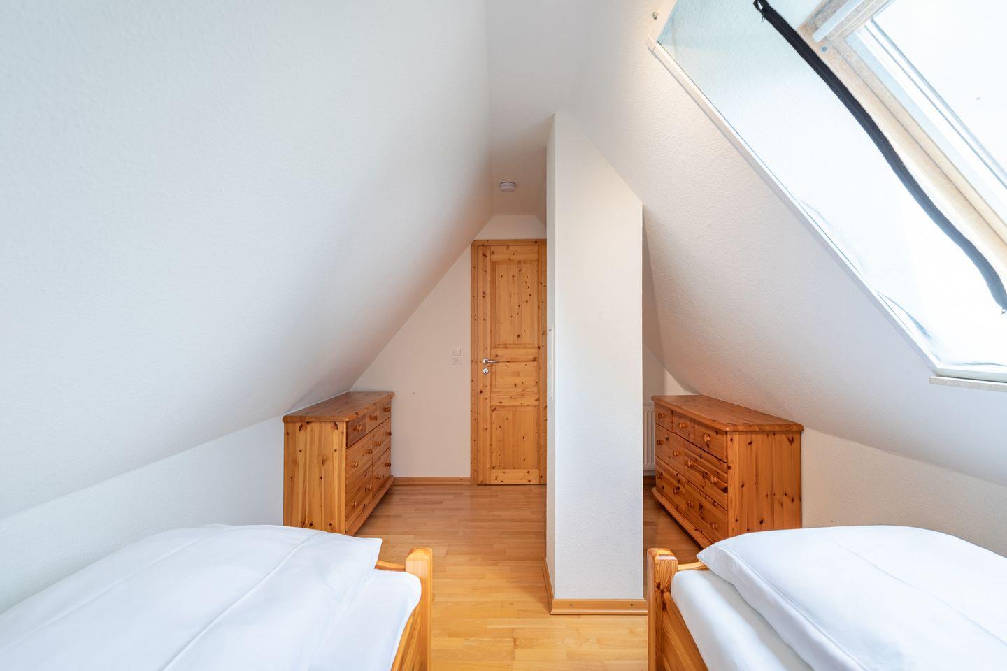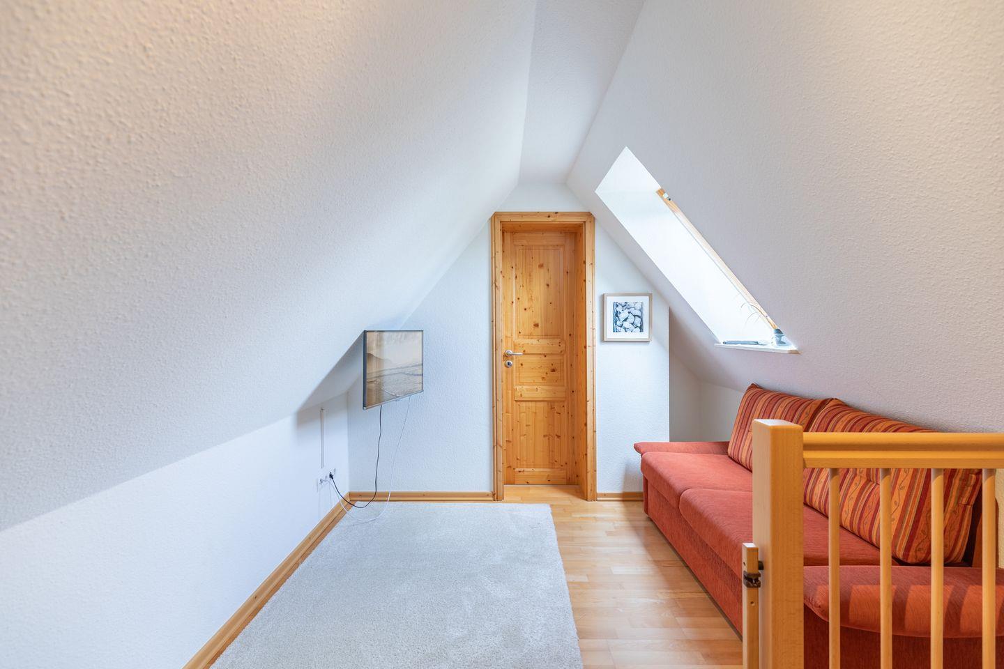 Über die Holztreppe gelangen Sie in das Dachgeschoss. Hier erwartet Sie zunächst ein kleiner Wohnbereich mit gemütlicher Couch und Fernseher, ideal zum Zurückziehen oder als zusätzlicher Spiel- und Entspannungsraum. Daneben befindet sich ein weiteres Schlafzimmer, ausgestattet mit zwei Einzelbetten (90 x 200 cm).