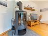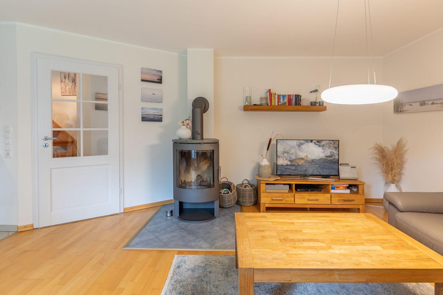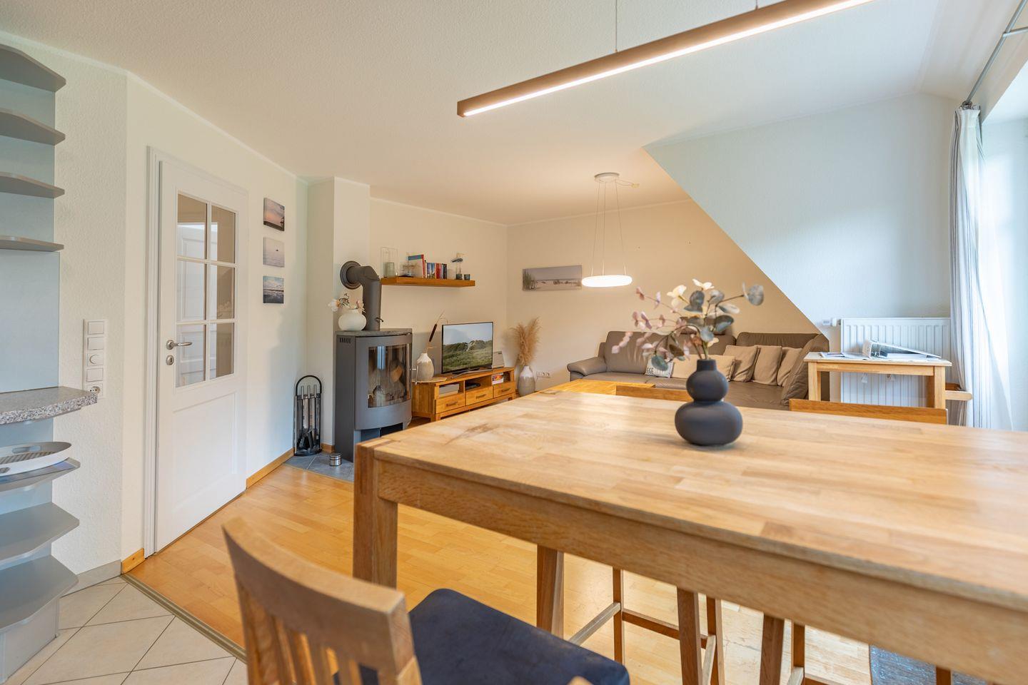 Die rund 80 m² große Ferienwohnung befindet sich in einem gepflegten Haus und bietet ausreichend Platz für bis zu 4 Personen. Der helle Wohn- und Essbereich ist offen gestaltet und bietet viel Platz zum Wohlfühlen. Im Wohnzimmer steht eine große Ledercouch mit Couchtisch, die zu entspannten Abenden einlädt. Für Unterhaltung sorgen ein moderner Flachbildfernseher sowie eine kleine Auswahl an Büchern und Spielen. Besonders gemütlich wird es am Kaminofen, der an kühleren Tagen für eine angenehme Atmosphäre sorgt.