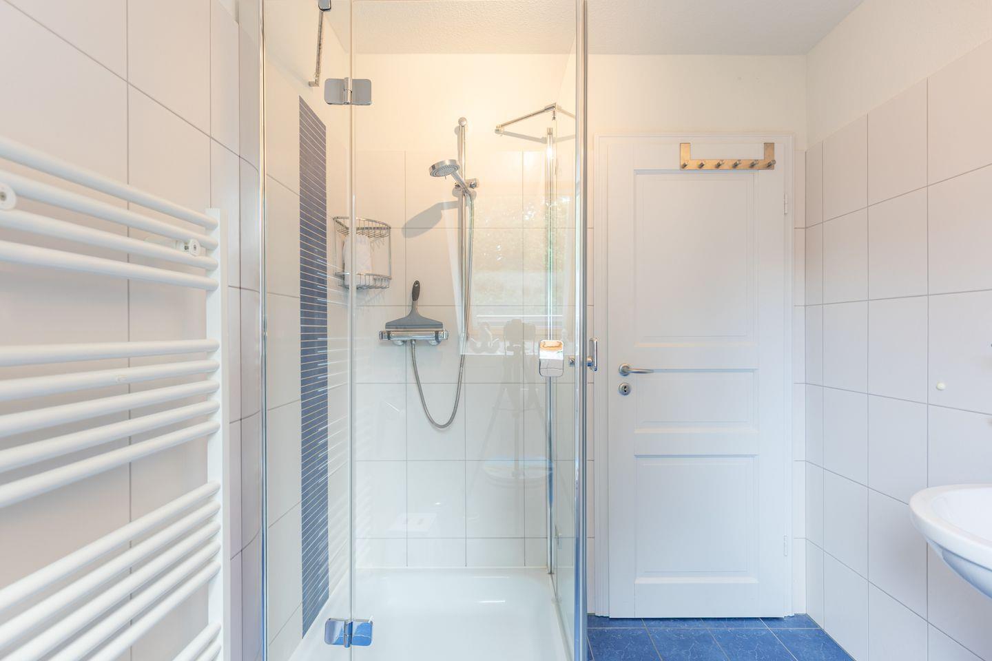 Das modern gestaltete Badezimmer mit Dusche ist hell gefliest und mit einem großen Fenster ausgestattet, das für angenehmes Tageslicht sorgt.
