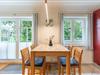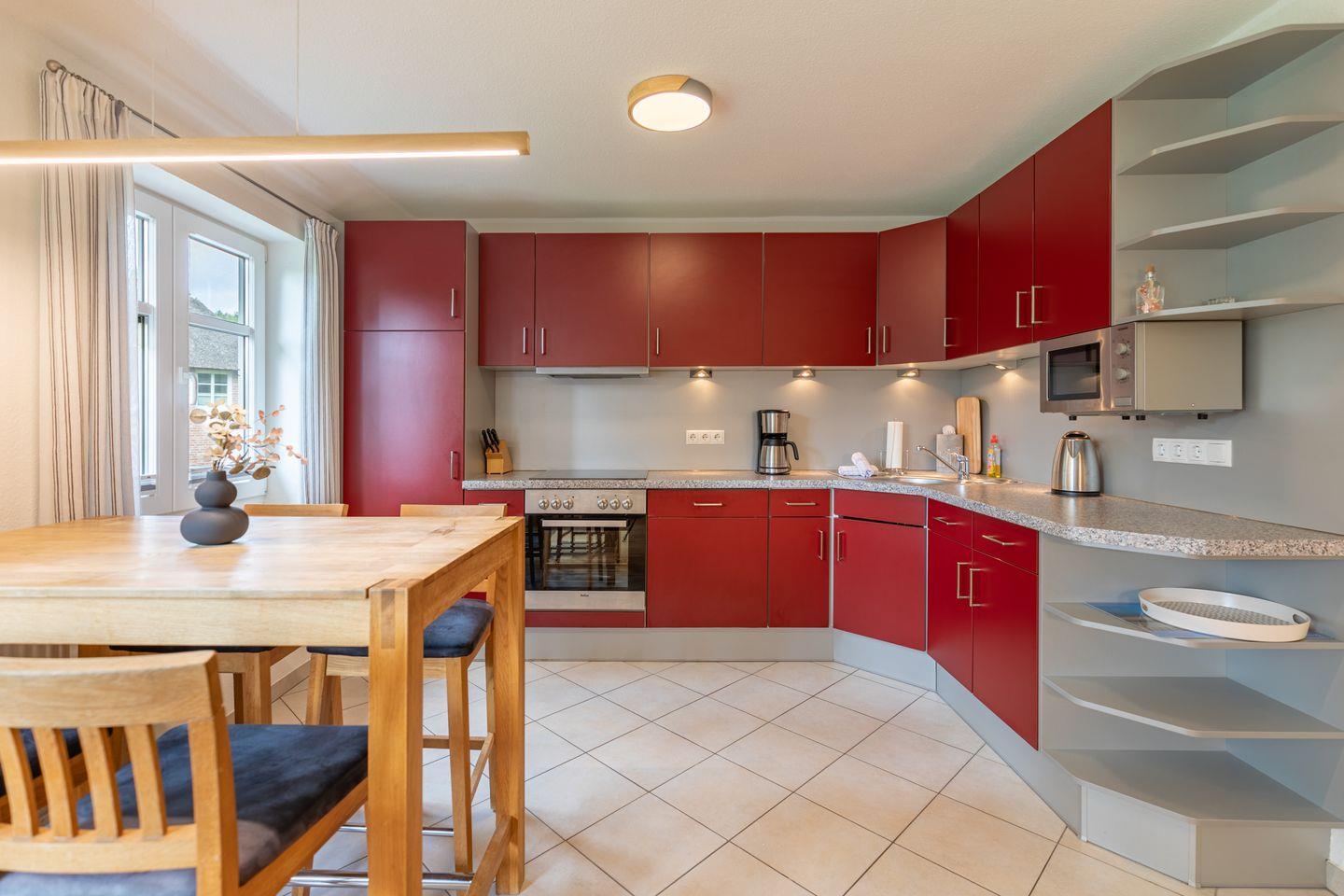 Die angrenzende, moderne Einbauküche ist vollständig ausgestattet und verfügt über einen Backofen mit Cerankochfeld, Kühlschrank mit Gefrierfach, Geschirrspüler, Mikrowelle, Kaffeemaschine, Wasserkocher und Toaster. Der große Esstisch mit vier Stühlen bietet ausreichend Platz für gemeinsame Mahlzeiten.