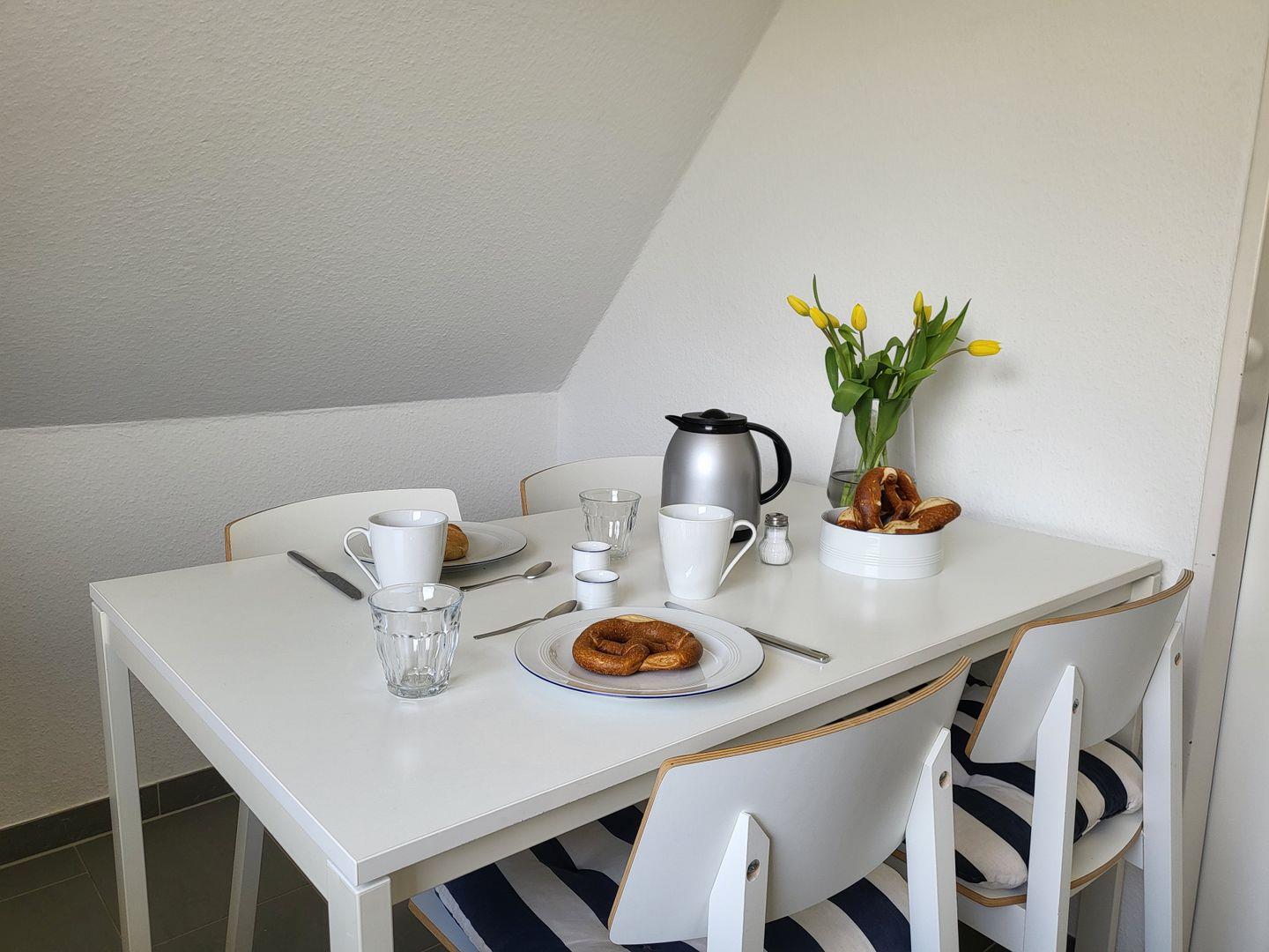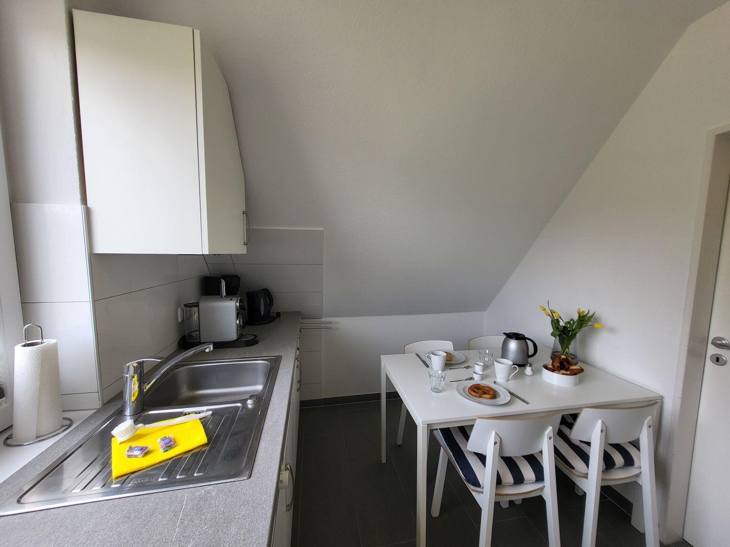 Für Ihre kulinarischen Bedürfnisse verfügt die Ferienwohnung über eine geschlossene Küche mit einem umfangreichen Angebot an Ausstattung: Ein Cerankochfeld, Backofen, Mikrowelle, Kühlschrank mit Gefrierfach, Geschirrspüler sowie verschiedene Küchenutensilien sind vorhanden, um Ihnen das Kochen zu erleichtern. Darüber hinaus stehen Ihnen eine Kaffeemaschine, Wasserkocher, Toaster und ein Eierkocher zur Verfügung – alles, was Sie für ein gemütliches Frühstück oder Abendessen benötigen.
