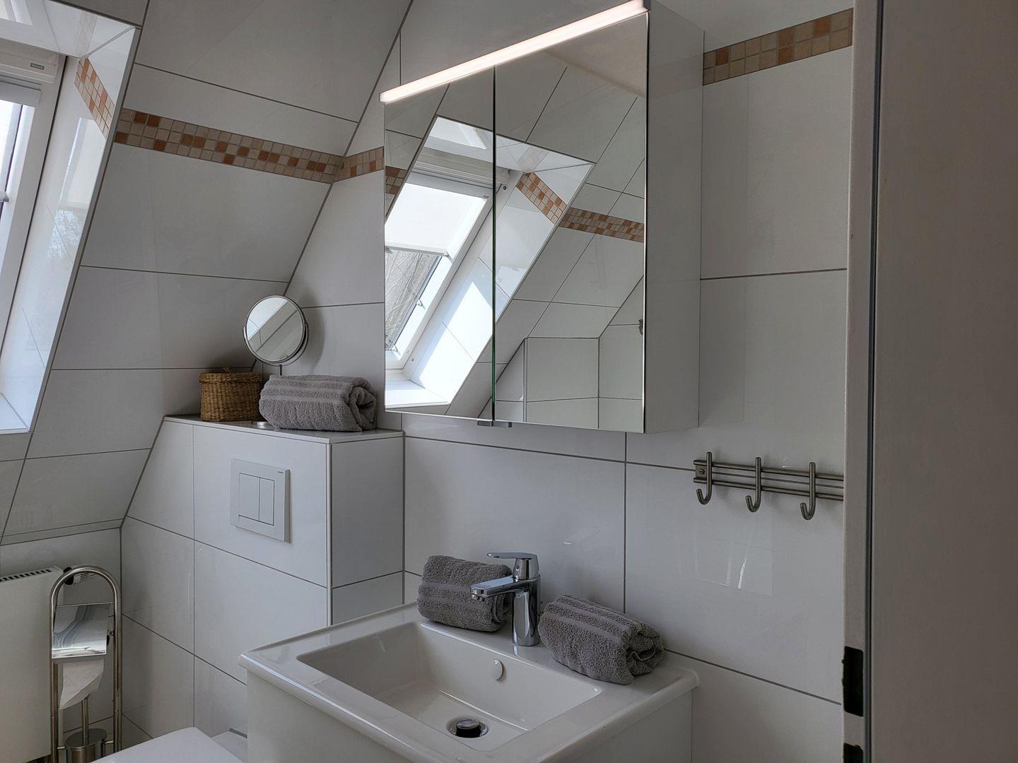 Das moderne und helle Badezimmer ist mit einer Dusche und einer Badewanne ausgestattet.