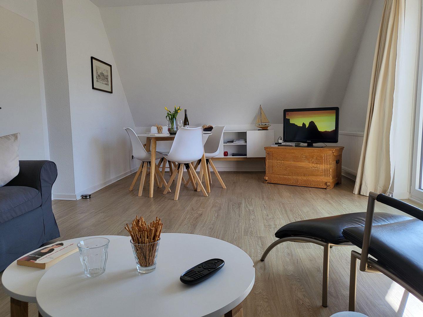 Die Ferienwohnung empfängt Sie in einem modernen, freistehenden Gebäude im ersten Stock. Sie betreten die Unterkunft und befinden sich in einem hellen Wohnbereich, ausgestattet mit einem zwei bequemen Sofas, einem gemütlichen Sessel, einem Esstisch einem Smart-TV und einer Bluetooth-Soundbox für entspannte Abende.