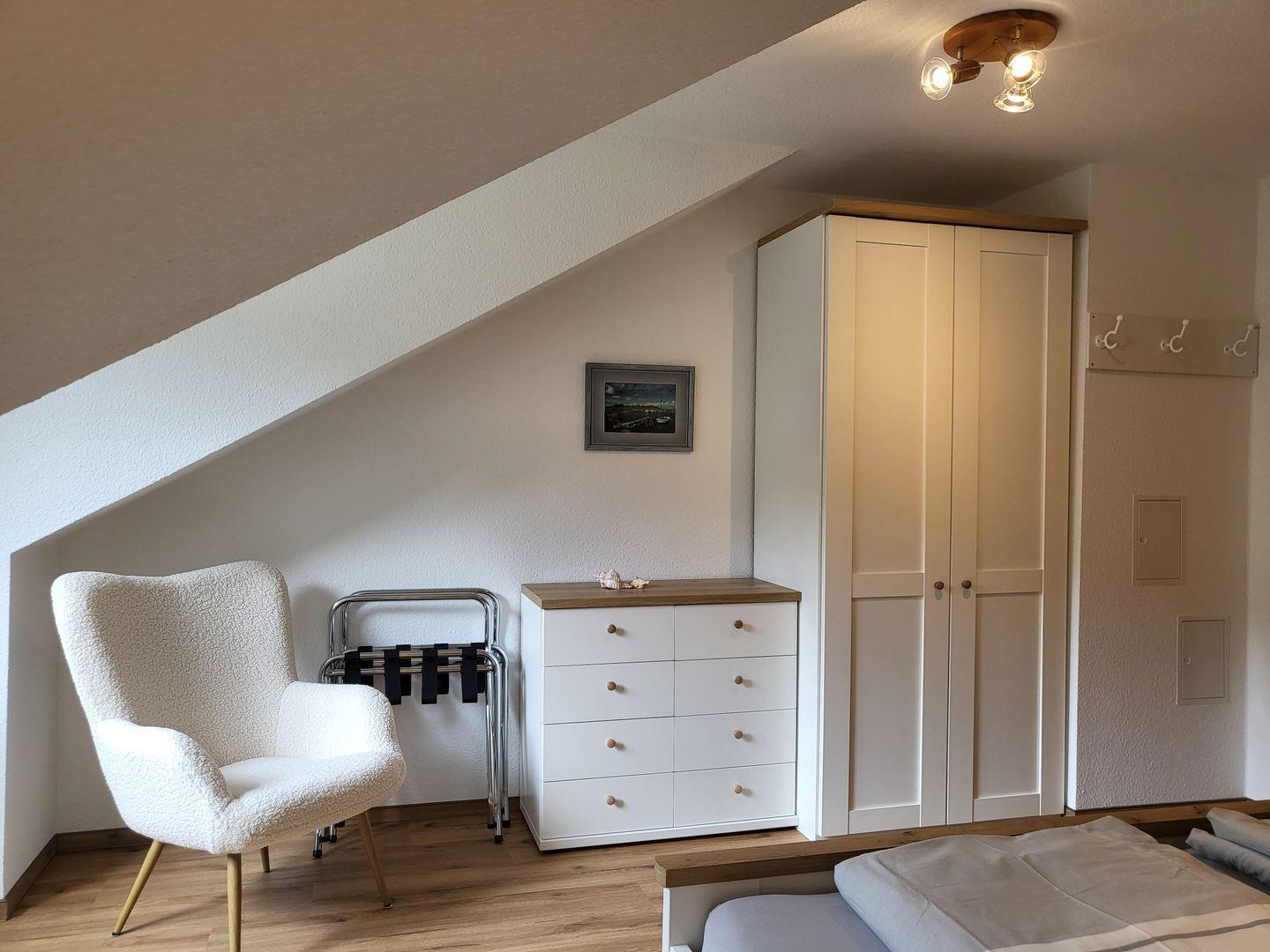 Es steht ein Schlafzimmer mit hochwertigem Vinylboden sowie einem gemütlichen Bett (180x 200) und einem Kleiderschrank zur Verfügung. Für eine zusätzliche Schlafmöglichkeit sorgt eine Schlafcouch (140x 200) im Wohnzimmer durch eine Trennwand integriert.