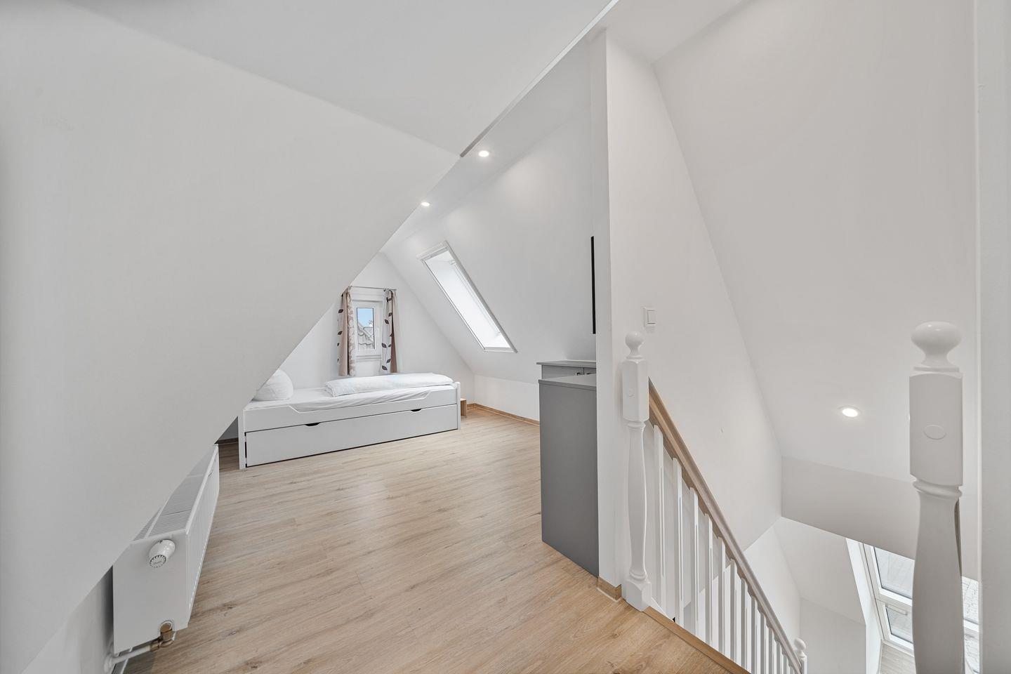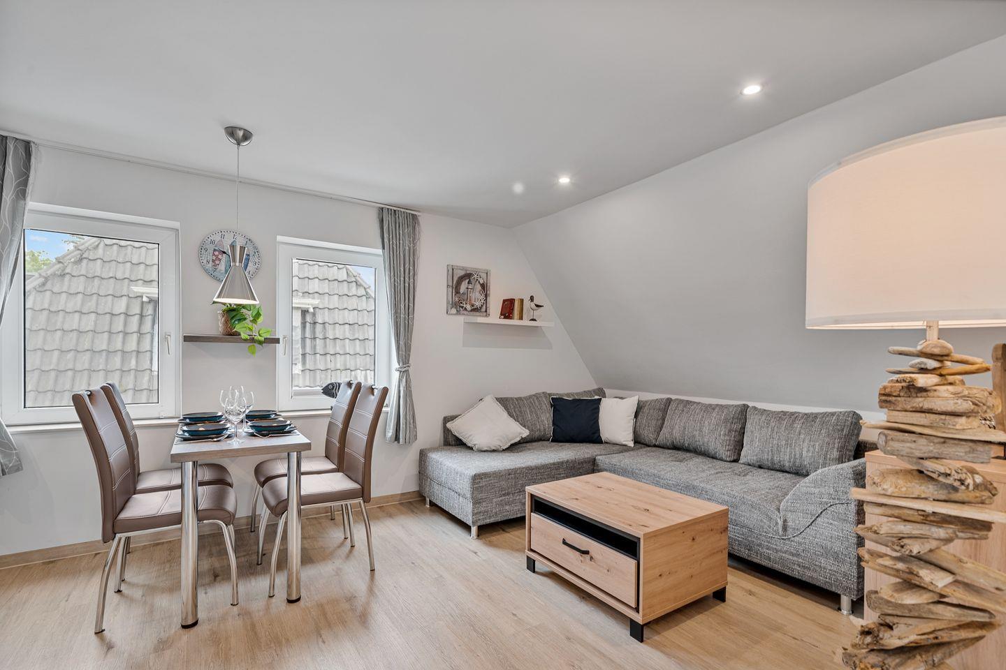 Das stilvolle Appartement „Ording“ im 1. Obergeschoss des KJELL HUS bietet auf ca. 74?m² Wohnfläche ein modernes und behagliches Zuhause auf Zeit – ideal für 1 bis 4 Personen. Der helle, geschmackvoll eingerichtete Wohnraum mit TV lädt zum Entspannen ein, während der angrenzende Essbereich eine gemütliche Atmosphäre für gemeinsame Mahlzeiten schafft. Die separate Küche ist hochwertig ausgestattet und bietet alles, was Sie für die Zubereitung kleiner oder großer Urlaubsmenüs benötigen. Zwei liebevoll gestaltete Schlafzimmer sorgen für erholsame Nächte – ideal für Familien, Paare oder Freunde. Zwei moderne Duschbäder bieten Ihnen dabei Komfort und Privatsphäre. Die klare, nordisch inspirierte Einrichtung, kombiniert mit modernen Möbeln und einer ruhigen Lage im Ortsteil Ording, macht diese Wohnung zum perfekten Ort für entspannte Urlaubstage an der Nordsee.