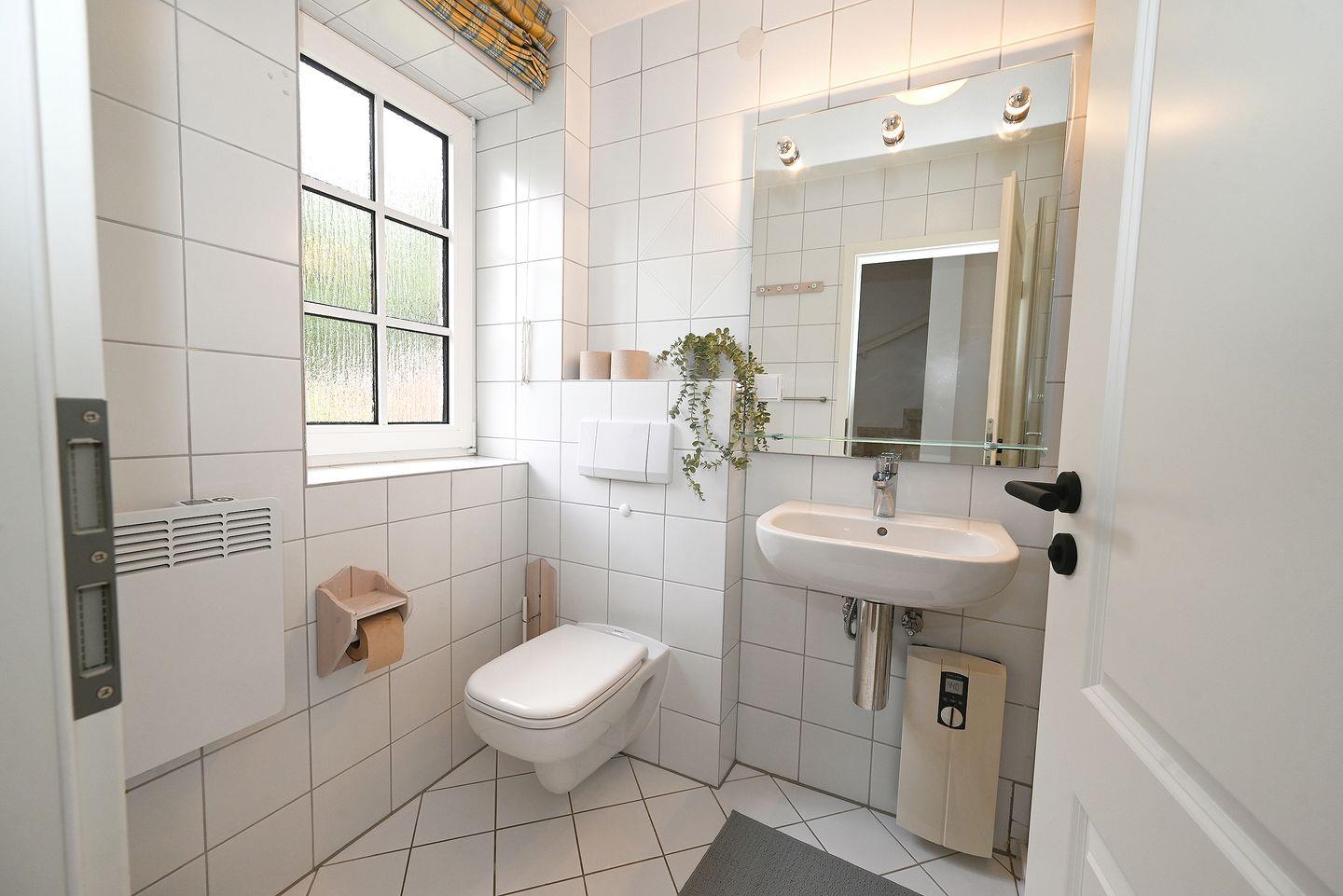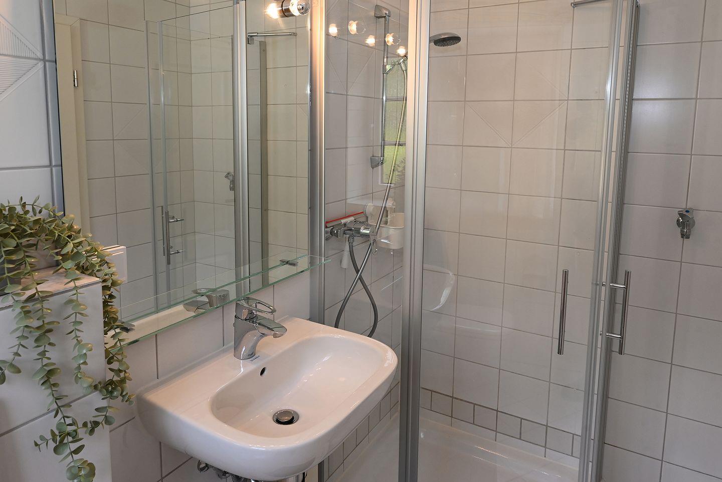 Das Badezimmer verfügt über eine bodengleiche Dusche, Spiegel und Fenster, sowie einen Haartrockner und bietet somit modernen Komfort.