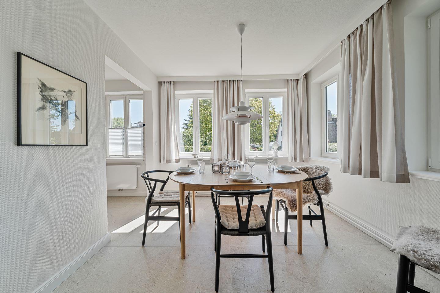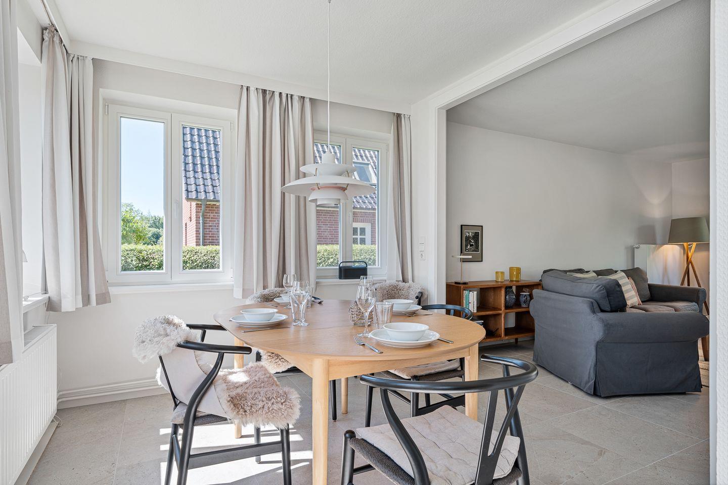 Das zweigeschossige Ferienhaus empfängt Sie auf Ebenen, die großzügig und lichtdurchflutet gestaltet sind. Im Parterre befindet sich ein einladender Wohnbereich, der durch eine offene Küche ergänzt wird. Diese ist modern eingerichtet und bietet zahlreiche Annehmlichkeiten. Ein Essbereich grenzt unmittelbar an den Küchenbereich und lädt zu gemeinsamen Mahlzeiten ein.