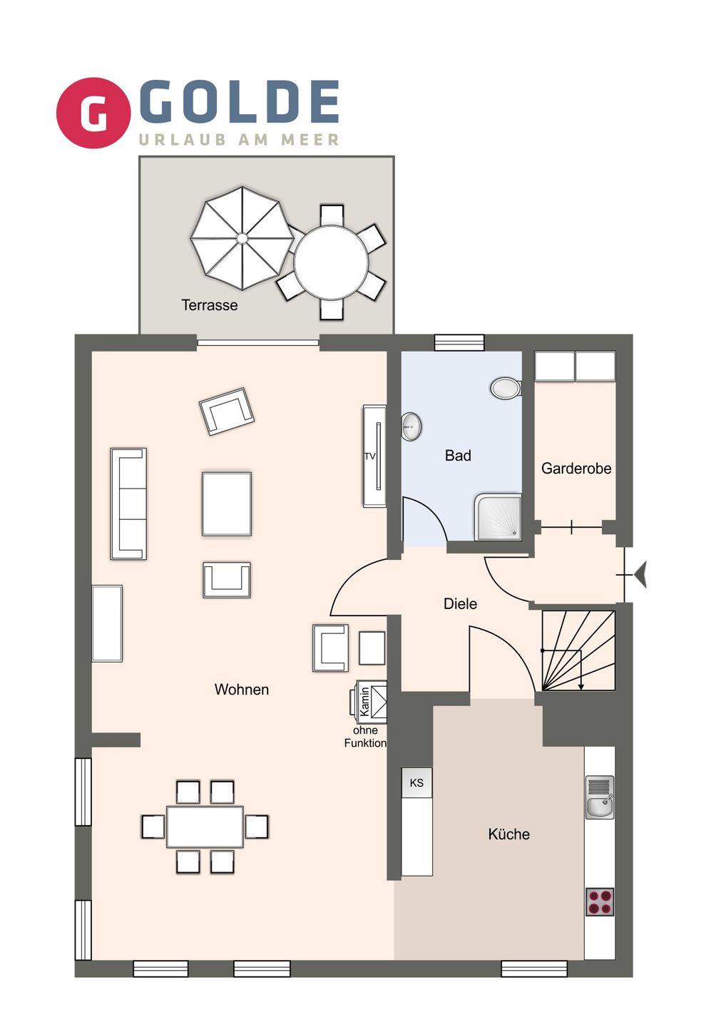 Das freistehende Ferienhaus Et gah uns wohl in Sankt Peter-Ording bietet auf 110?m² Komfort für bis zu fünf Personen. Es verfügt über drei Schlafzimmer, zwei Badezimmer mit Duschen, eine offene Küche zum Wohnzimmer, Terrasse, Garten mit Gartenmöbeln.