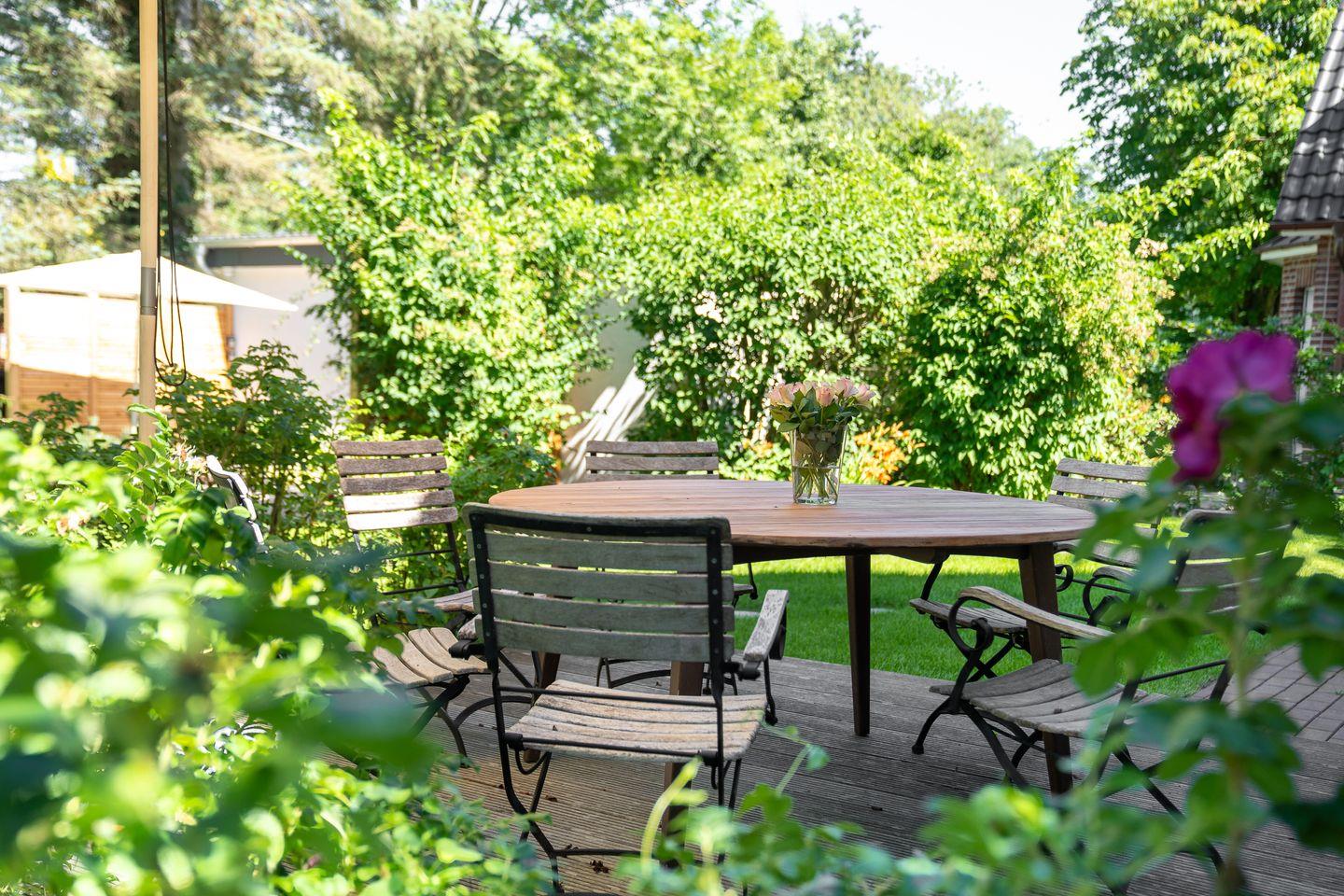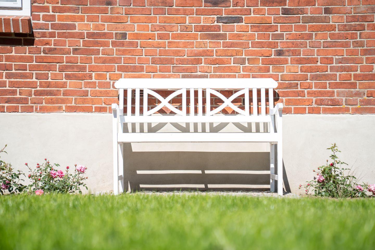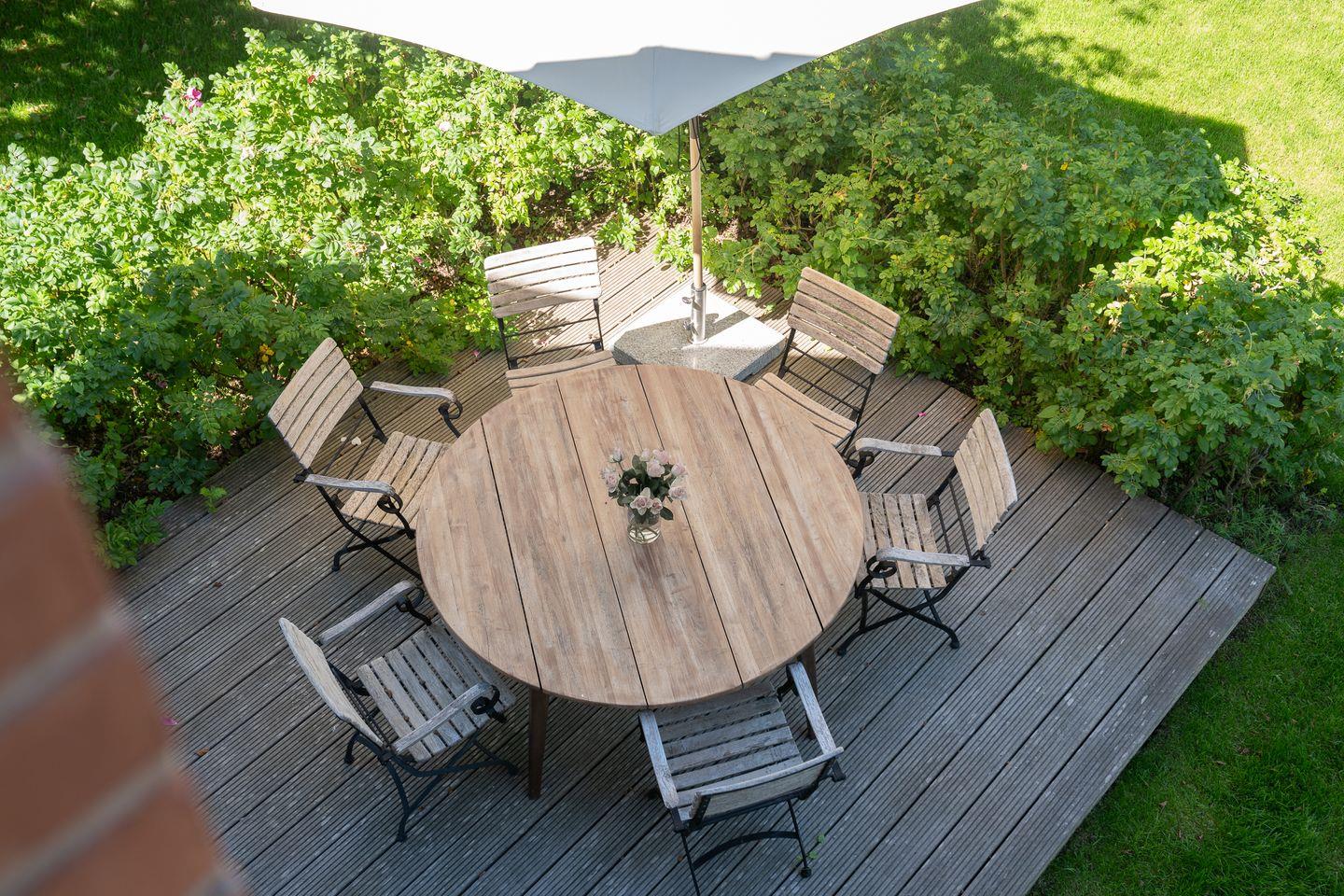 Der Außenbereich eröffnet zahlreiche Möglichkeiten zur Entspannung. Eine Terrasse mit Gartenmöbeln und Sonnenschirm lädt zum Verweilen ein, während eine Liegewiese weitere Erholung bietet. Die großen Fenster sind durch Sichtschutz und die Schlafräume mit Fliegengitter geschützt, sodass Sie auch an warmen Tagen komfortabel lüften können. Ein historischer Kamin ist nicht funktionsfähig, dennoch wunderschön dekorativ.