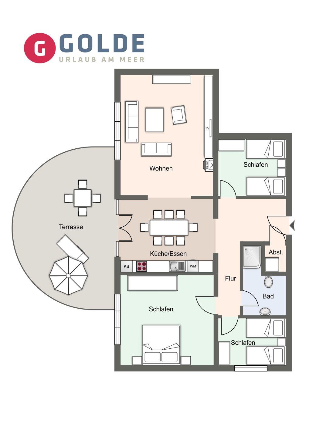 Die stilvoll eingerichtete Erdgeschosswohnung im Appelsnuut bietet auf rund 112?m² großzügigen Raum für einen entspannten Nordseeurlaub.
