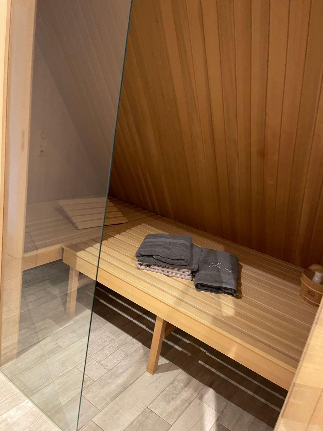 Beide Bäder sind hochwertig ausgestattet, eines davon mit Dusche, Badewanne und integrierter Sauna. WLAN, Waschmaschine, Trockner, Fußbodenheizung und ein Flachbild-TV sorgen für modernen Wohnkomfort.