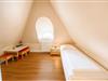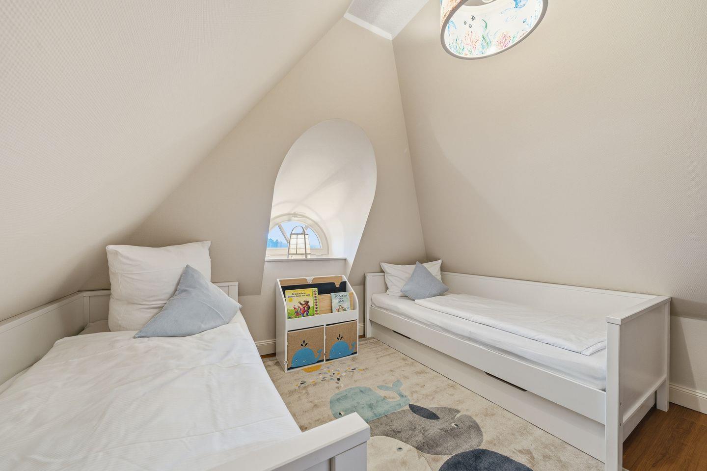 Das Dachgeschoss beherbergt ein weiteres Schlafzimmer mit einem Einzelbett, wo sich ein Kinderparadies mit Spielsachen und Kindermöbeln befindet.