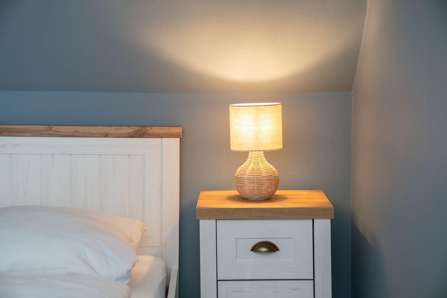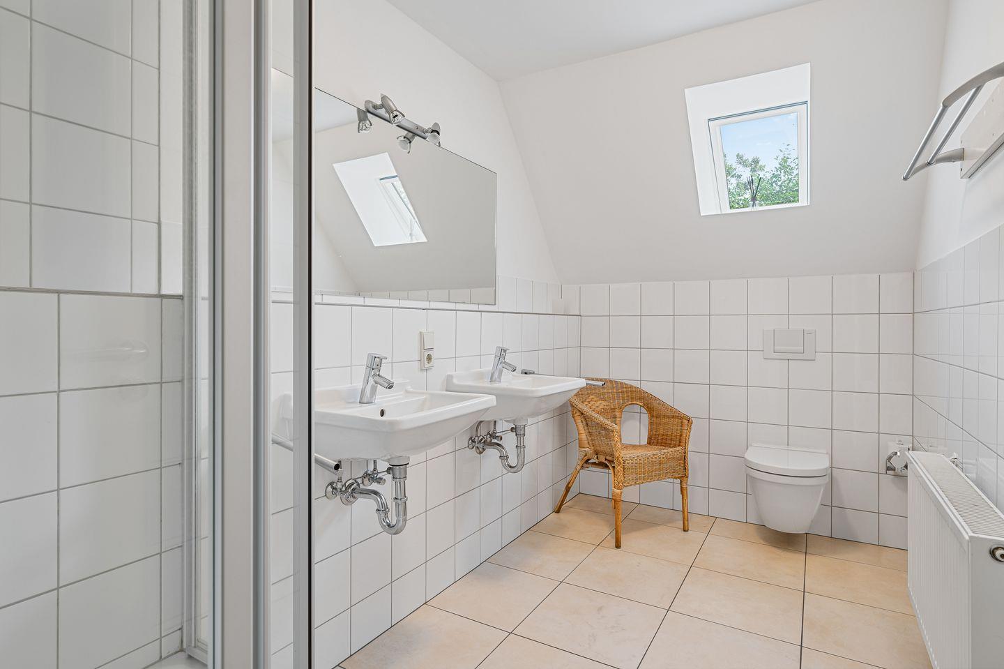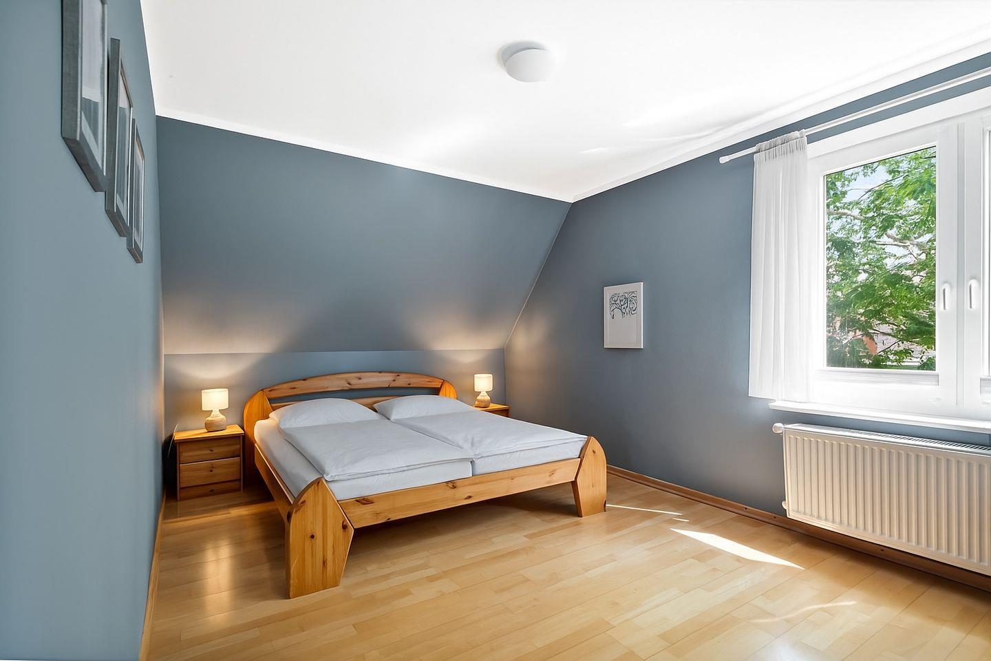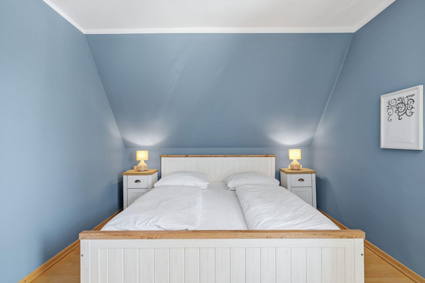 Über eine Holztreppe gelangen Sie in das Obergeschoss. Ein Schlafzimmer mit einem Doppelbett (1,80 x 2,00) ist ausgestattet mit einem großen Kleiderschrank. Darüber hinaus befindet sich im Obergeschoss ein weiteres Bad mit Dusche.